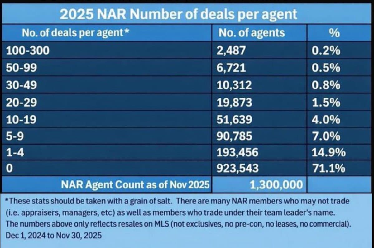 The NAR chart is brutal. Out of 1.3 million agents, 923,543 logged exactly zero MLS resale deals between Dec 2024...
