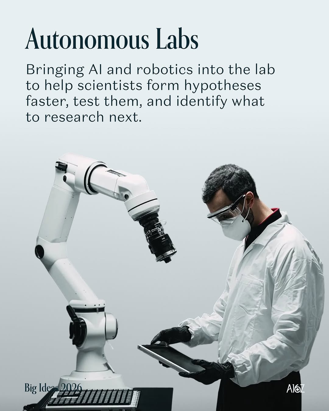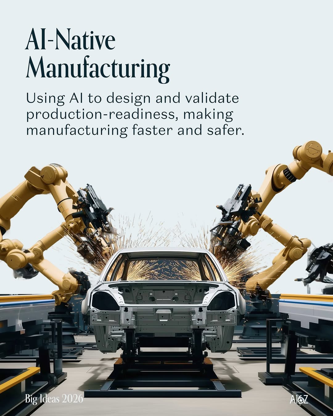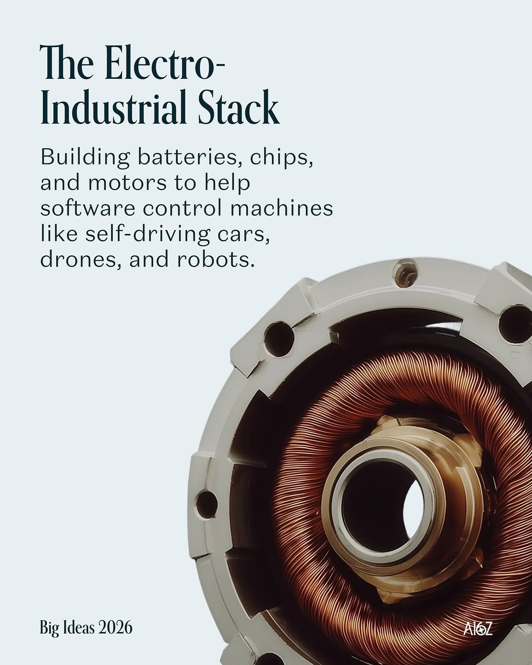 If you’re staring at the 2026 runway wondering what to build, this a16z carousel is a cheat sheet. A supersonic jet, robot arms, power plants, copper coils, and a robot scientist all scream the same thing: atoms are back. The biggest startup ideas aren’t another chat app, they’re software eating the physical world. Here are four bets the slides practically dare you to build.