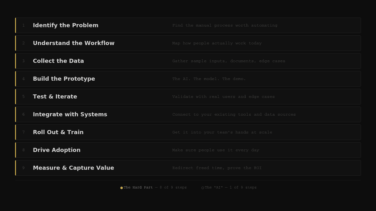Most teams jump straight to playing with models and wonder why their AI project stalls. The image breaks down a smarter way: only one of nine steps is actually about the AI itself. The rest is unsexy, operational work. Use this playbook to turn random experiments into repeatable, ROI-producing systems.
