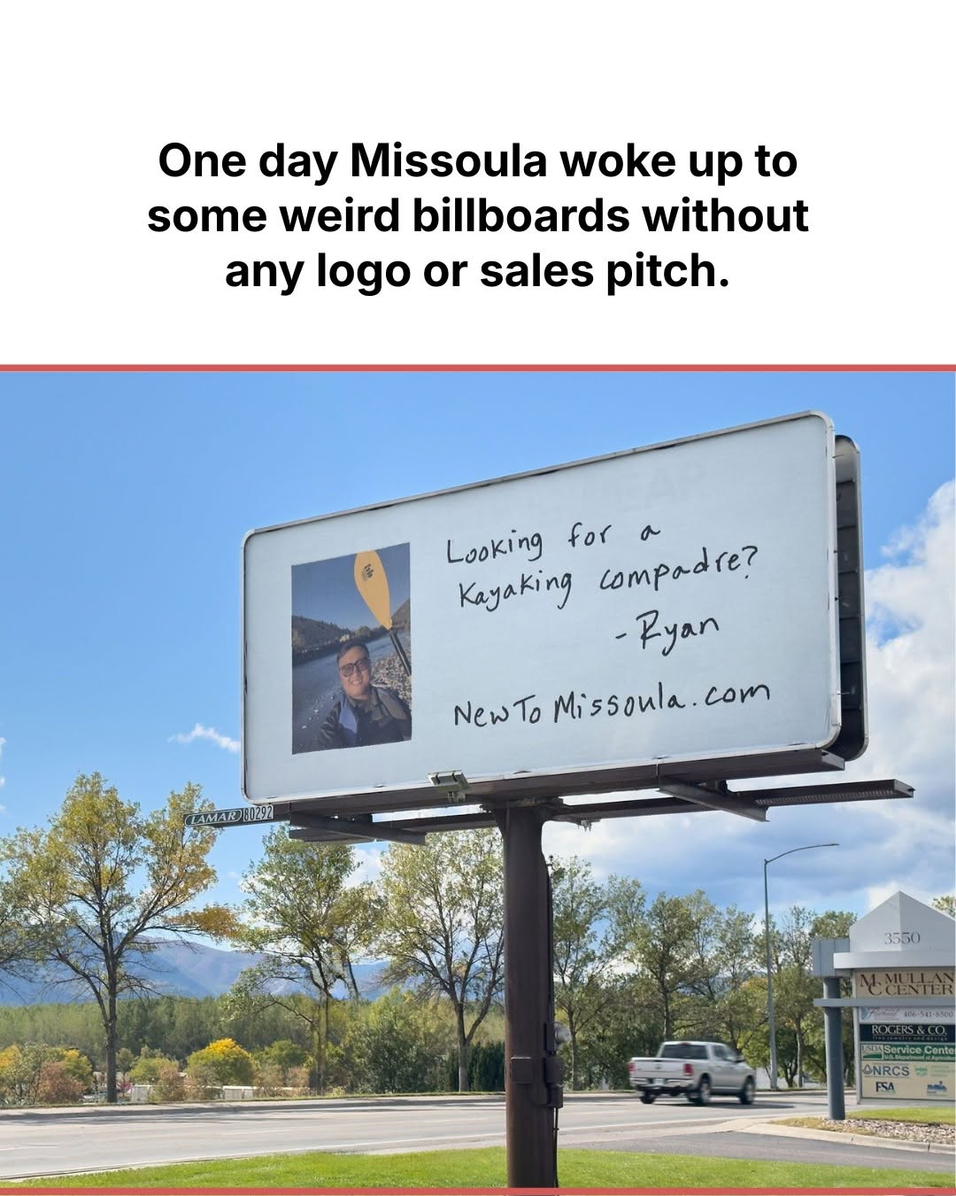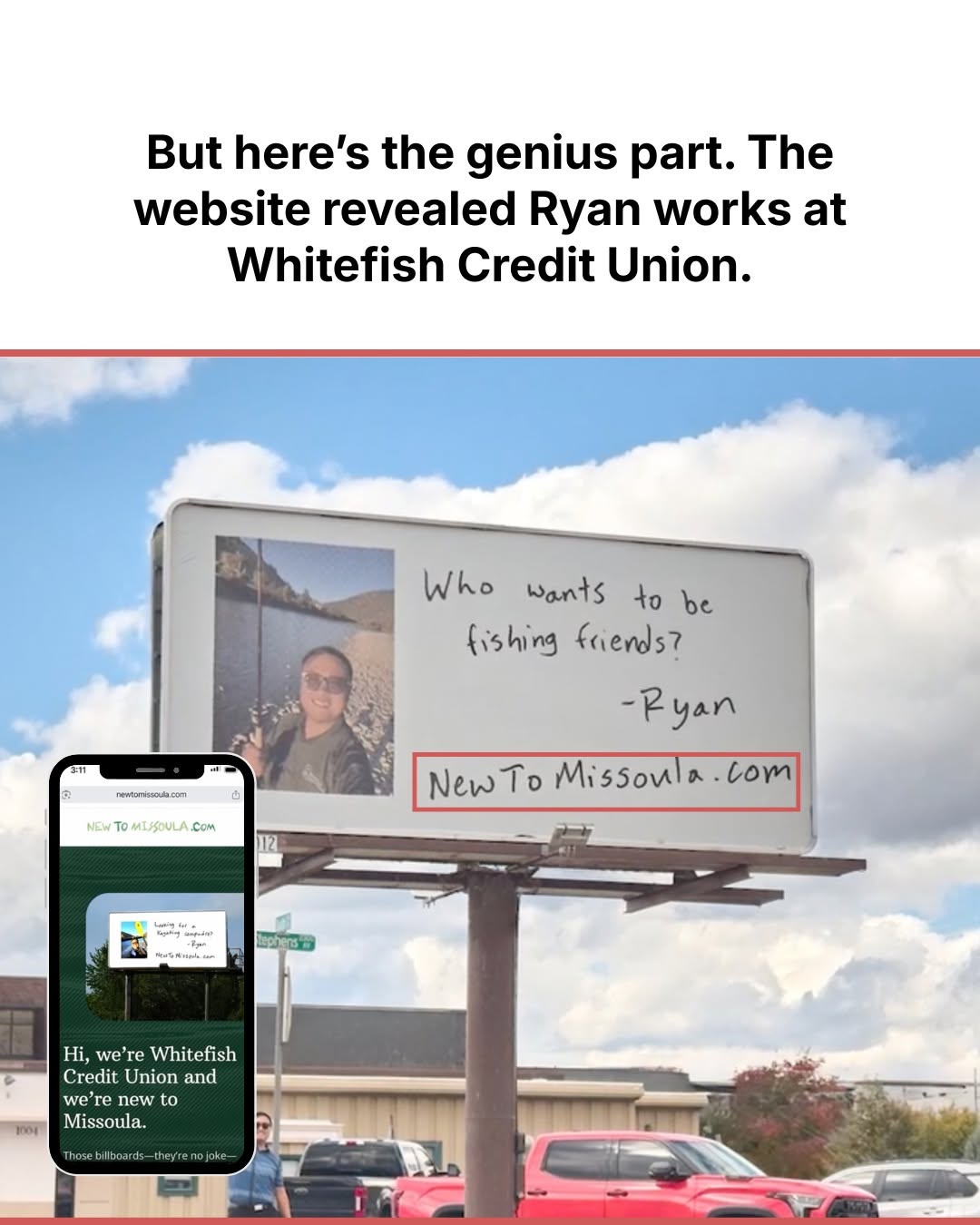 When Whitefish Credit Union moved into Missoula, they didn’t scream, “NOW OPEN.” They put up billboards that looked like a lonely guy’s notebook: Ryan’s selfie, a fishing rod, and a scribbled line asking for friends. No logo, no offer, no rate. Just a URL: NewToMissoula.com. The result: viral screenshots, packed comment threads, real friendships, and $20 million in deposits in month one.