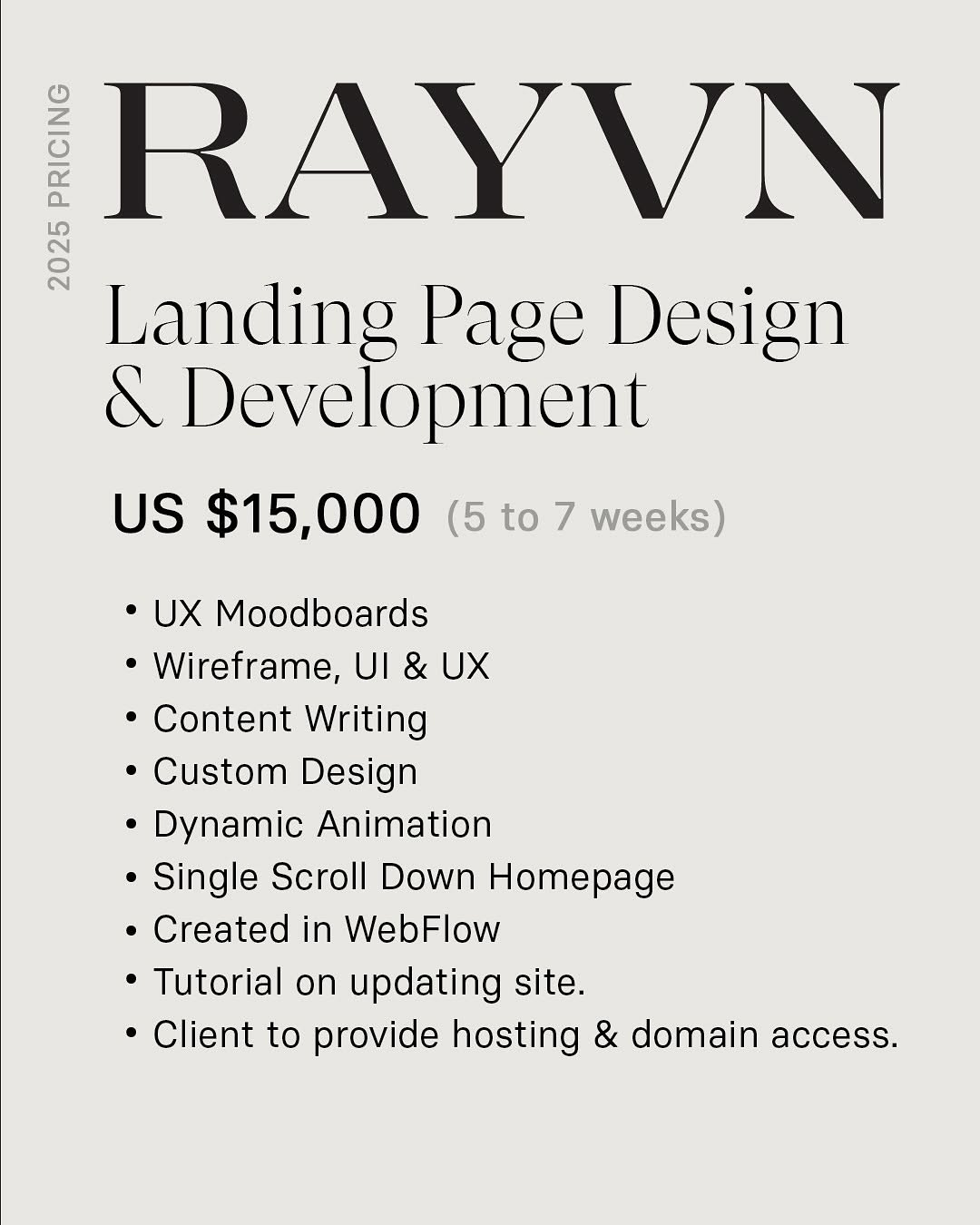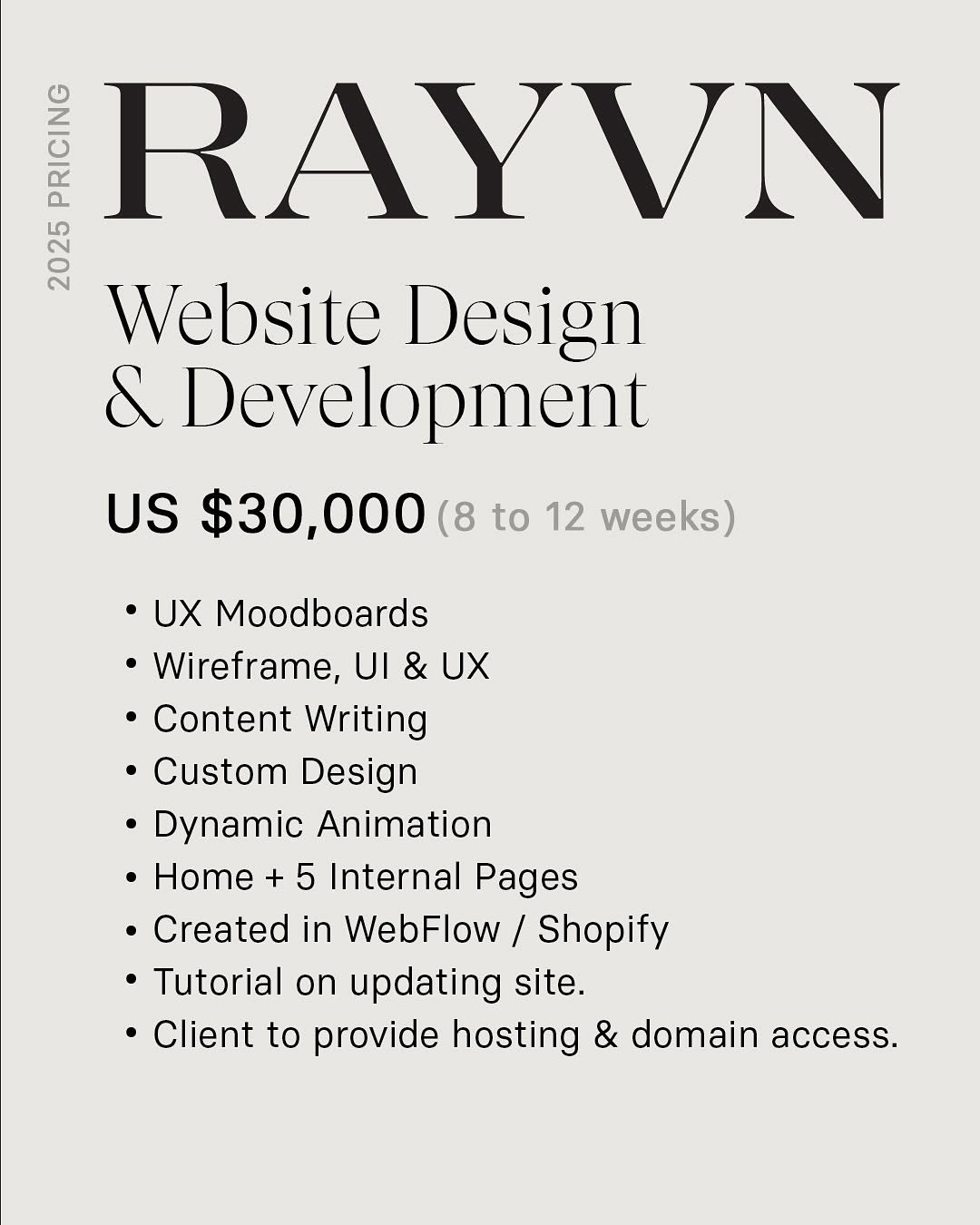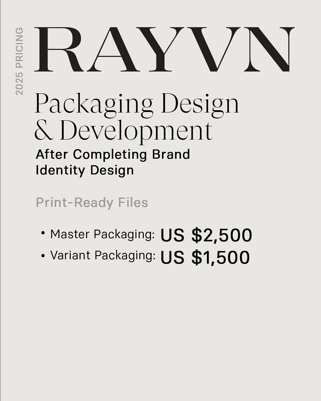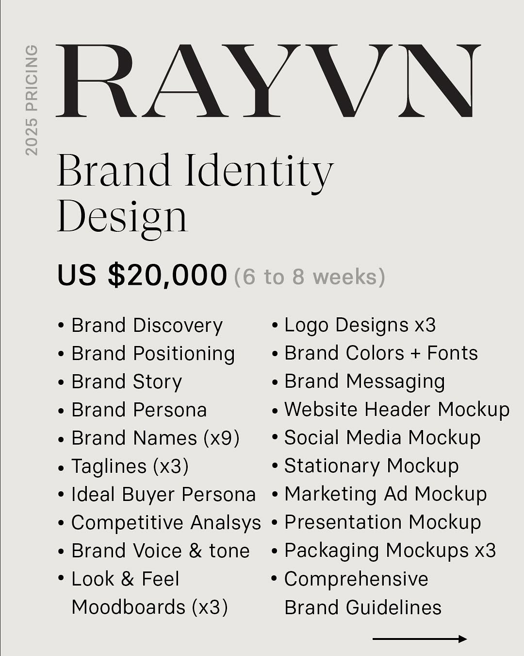 RAYVN publishes a $60,000 full brand system that bundles strategy, identity, packaging, website, and content into one revenue‑focused engagement.