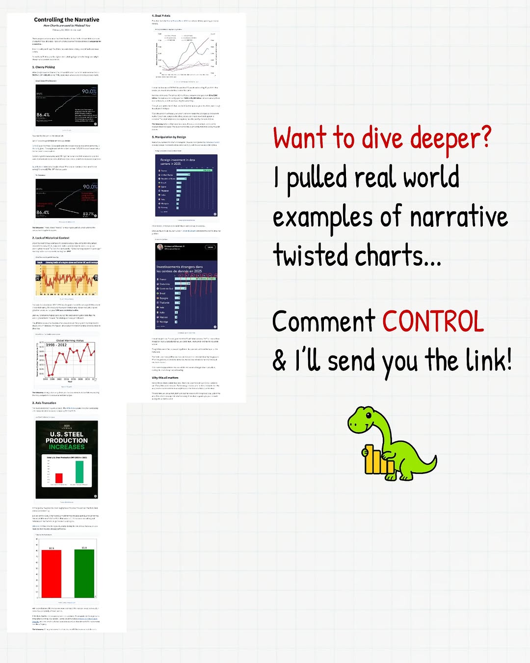This Instagram post is a masterclass in exposing sneaky chart tricks while quietly building an email list. On the left, you see a long, scrollable breakdown of misleading real‑world charts; on the right, a clean, bold promise: comment CONTROL for the full teardown. It sells skepticism, curiosity, and a next step in three seconds flat.