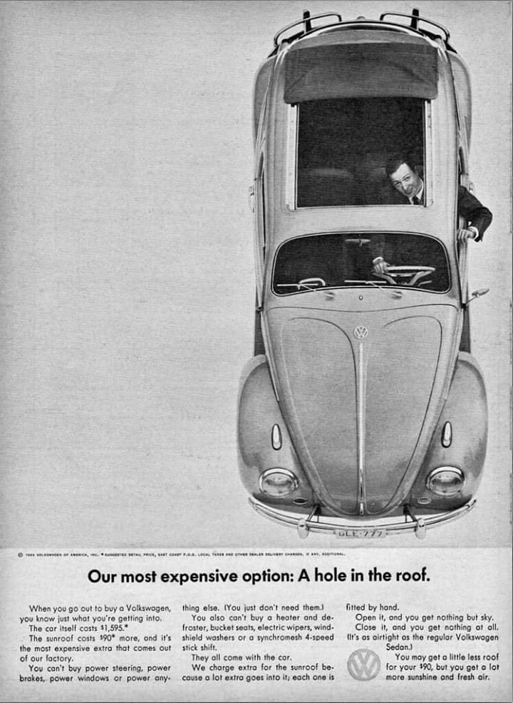This VW Beetle ad harps on the fact the car has barely any expensive options, so for the list price of $1,595 you could get pretty much the entire package....no crazy expensive extra options needed!