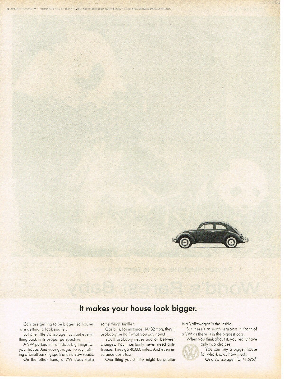 This Volkswagen Bug ad from 1964 has a catchy headline, but gets the reader to understand that the smallness of the car is it's major benefit....it uses less gas, lower maintenance bills, barely any upkeep costs.