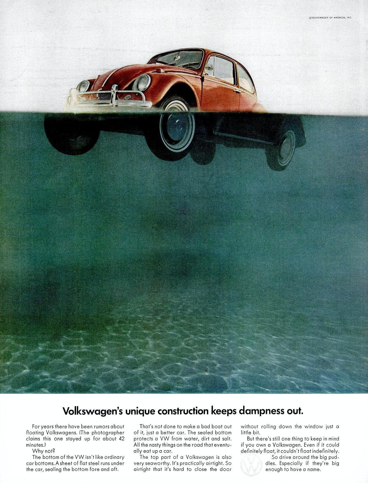 This clever ad talks about how a Volkswagen Beetle can actually FLOAT IN WATER!
