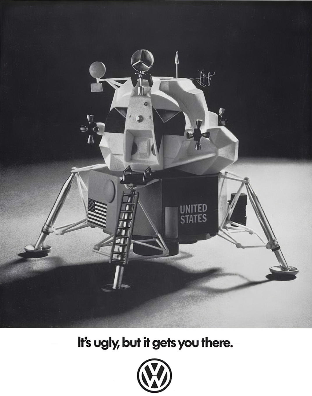 Two weeks after the first lunar excursion modules landed on the Moon, Volkswagen promoted their notoriously "ugly" VW Beetle with this ad.