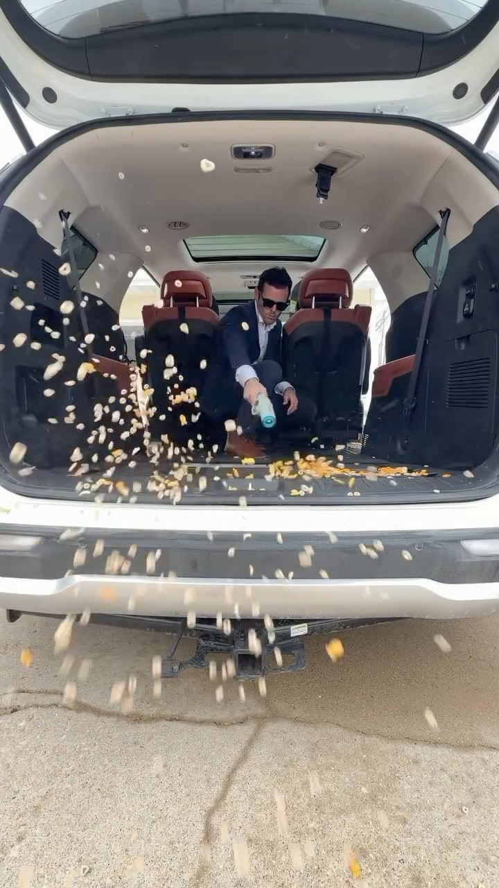 This shot makes cleaning look less like a chore and more like an action movie. A suited guy in shades is kneeling in the back of an SUV, blasting a crazy mess of crumbs straight toward the camera with a tiny Shark BlastBoss. The cereal explosion sells the feeling better than any boring product demo ever could.