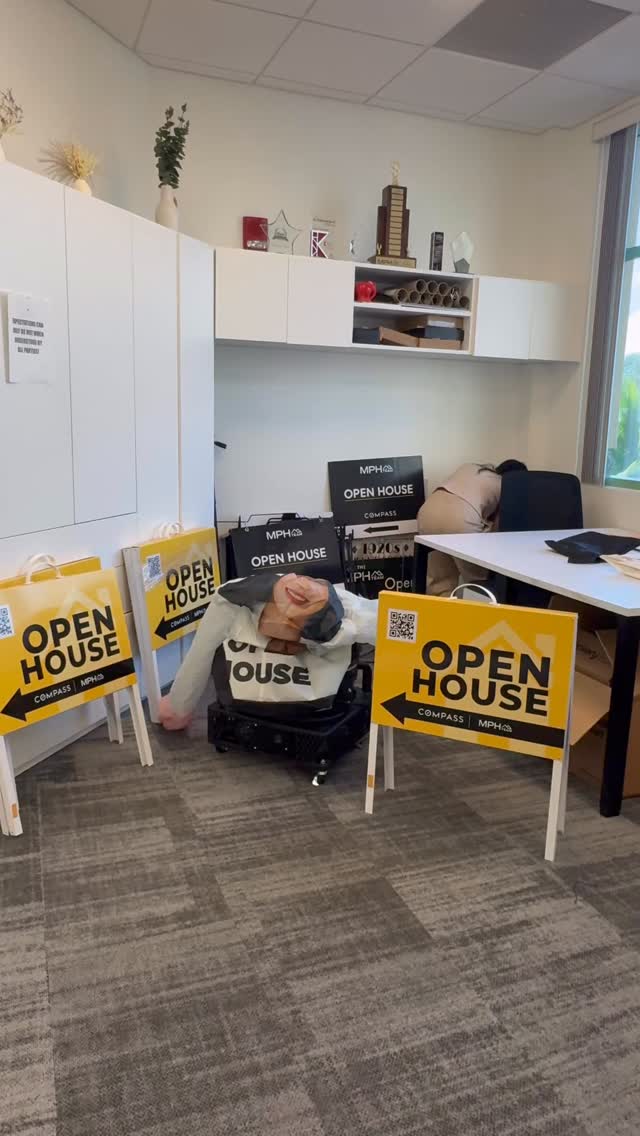 On the floor of a normal real estate office, a deflated “agent” in an OPEN HOUSE sweater looks like forgotten swag. Flip the switch and it snaps upright into a life-sized host. Suddenly every boring yellow sign has a mascot drivers cannot ignore.