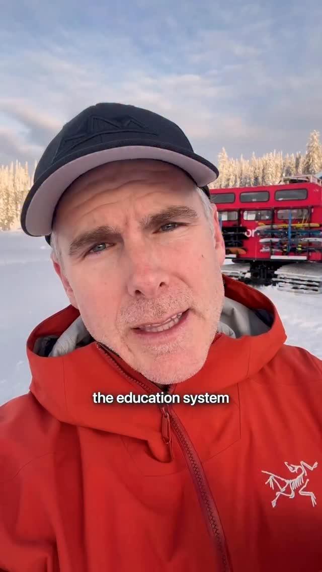 A guy in a bright red jacket, standing in deep snow, calmly says Google has already fixed school. No classroom. No whiteboard. Just a phone and a brain. This visual sells a controversial idea in one glance: memorization is obsolete and search is the new superpower.