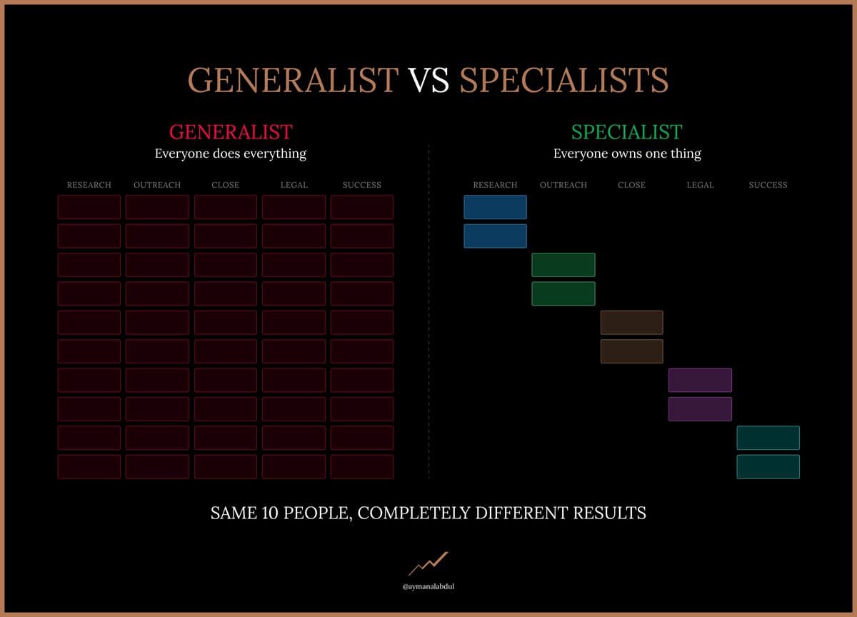 Steal the layout from the specialist side of the image. Map your buyer journey into stages: research, outreach, close, legal, success. Then assign owners, not helpers, to each step. Your “research specialist” lives in spreadsheets. Your SDR lives in the inbox. Your AE lives on Zoom. Your deal team lives in docs. Your partner success team lives in results. Same payroll, new process, bigger pipeline.