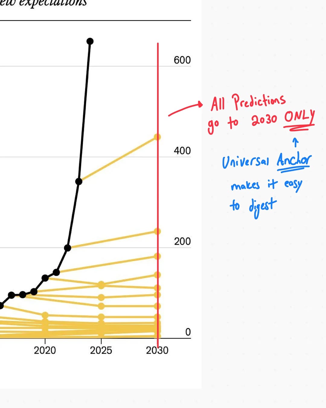 - Every forecast ends at the same 2030 red anchor, making dozens of lines instantly comparable.