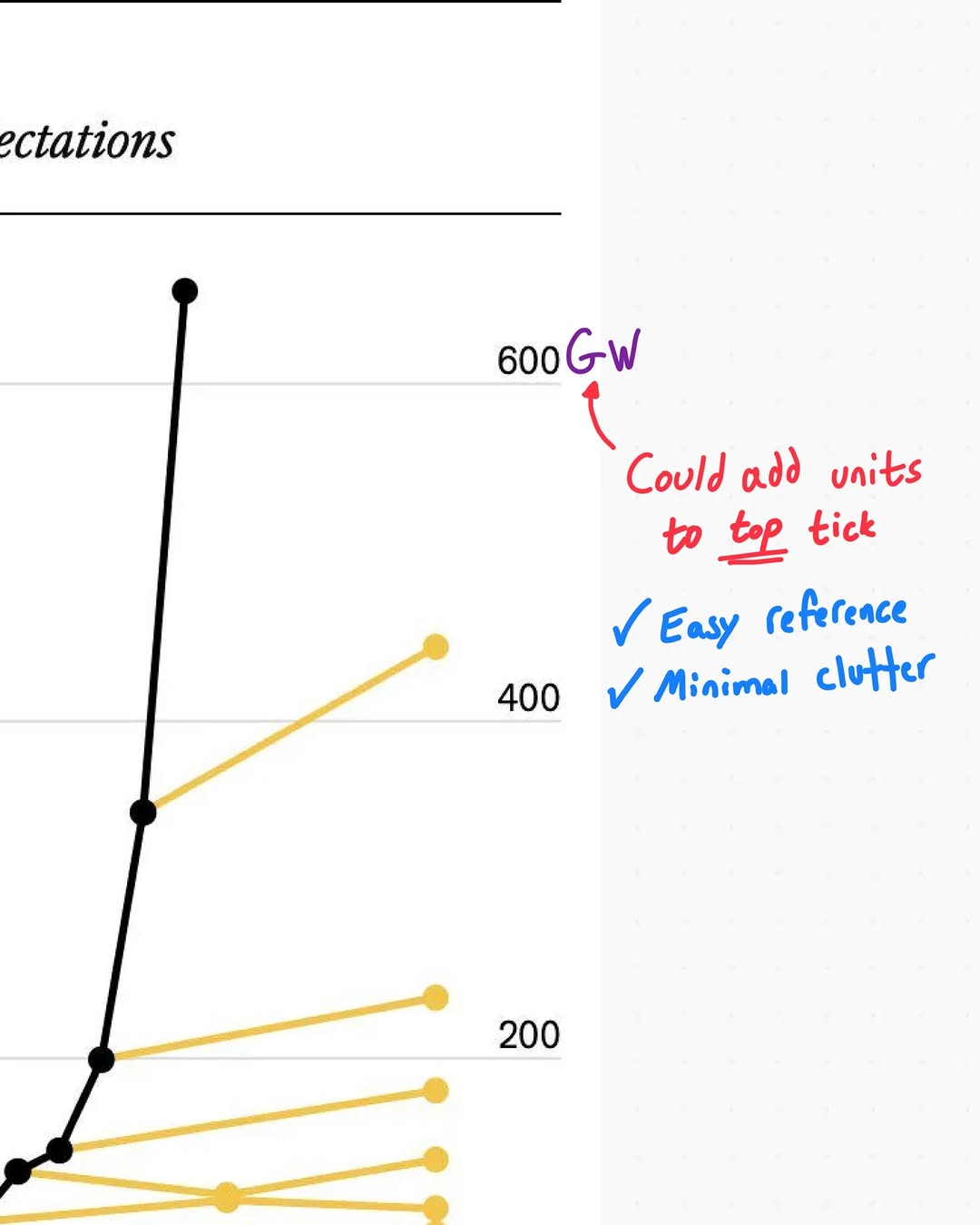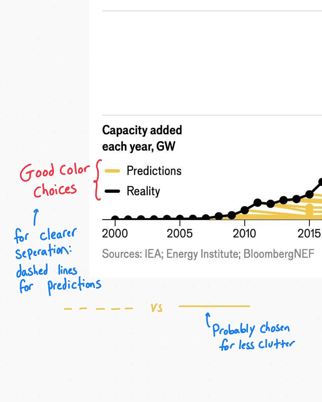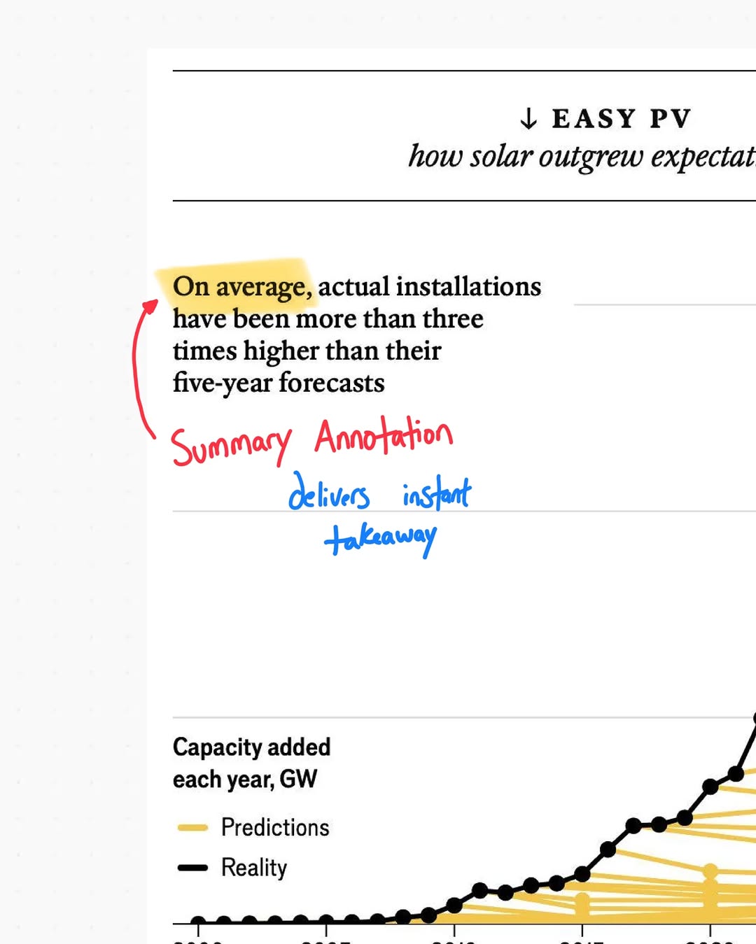 Your eye first grabs the bold claim, then traces that black curve shooting past the timid yellow forecasts. The design makes the emotional punch (wow, they underestimated solar) arrive before the analytical details. That order is what turns dry energy data into a share-worthy chart.
