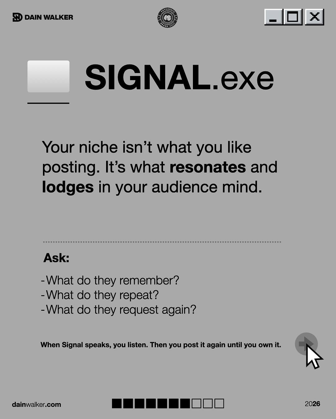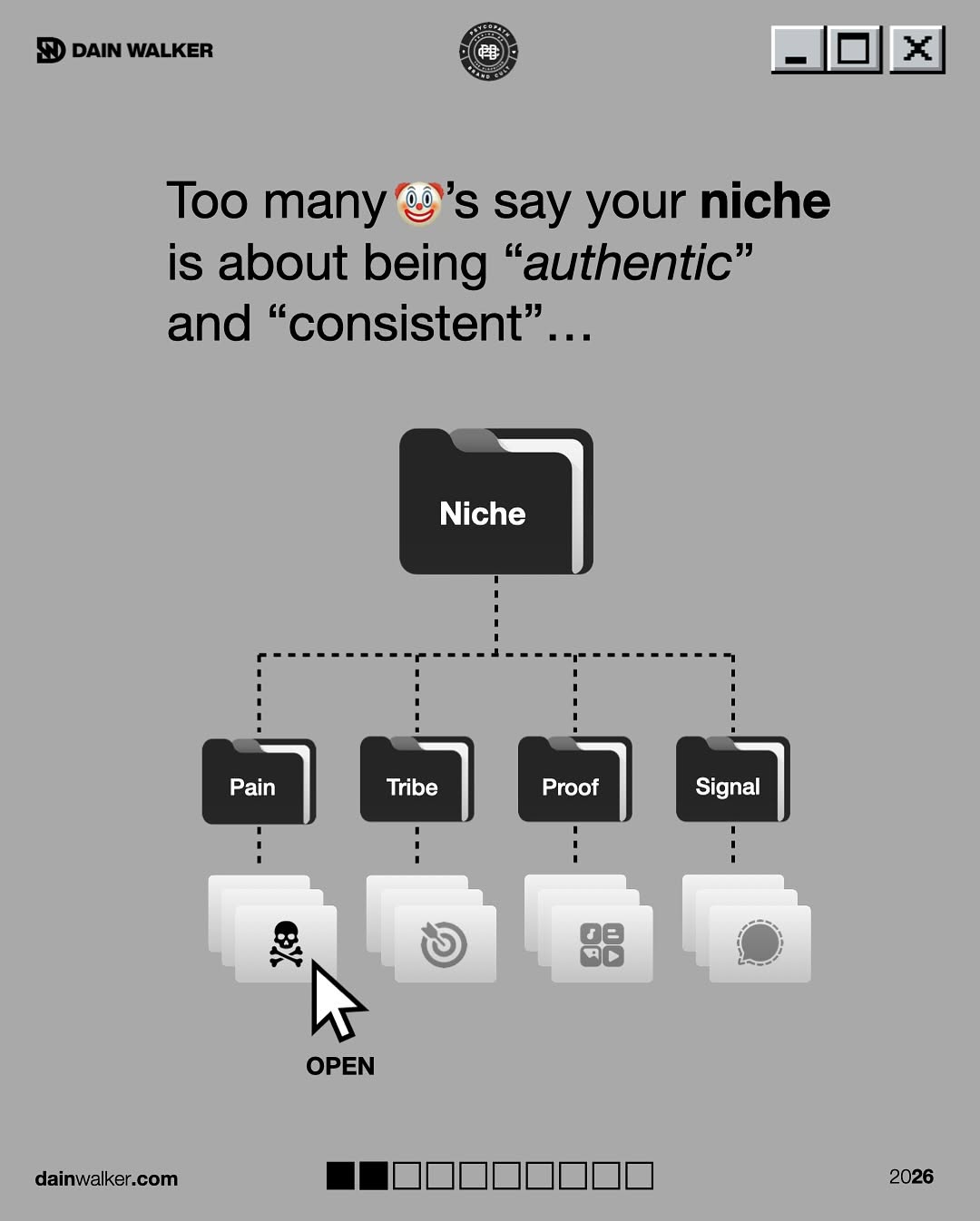 The Instagram carousel turns “finding your niche” into a desktop interface: one big NICHE folder, powered by four .exe files labeled Pain, Tribe, Proof, and Signal. It’s a smart visual because it shows your niche isn’t a vibe, it’s a system you actually run. Instead of stressing over content pillars, you click into each file and make your brand unforgettable. Use this post as your install guide.