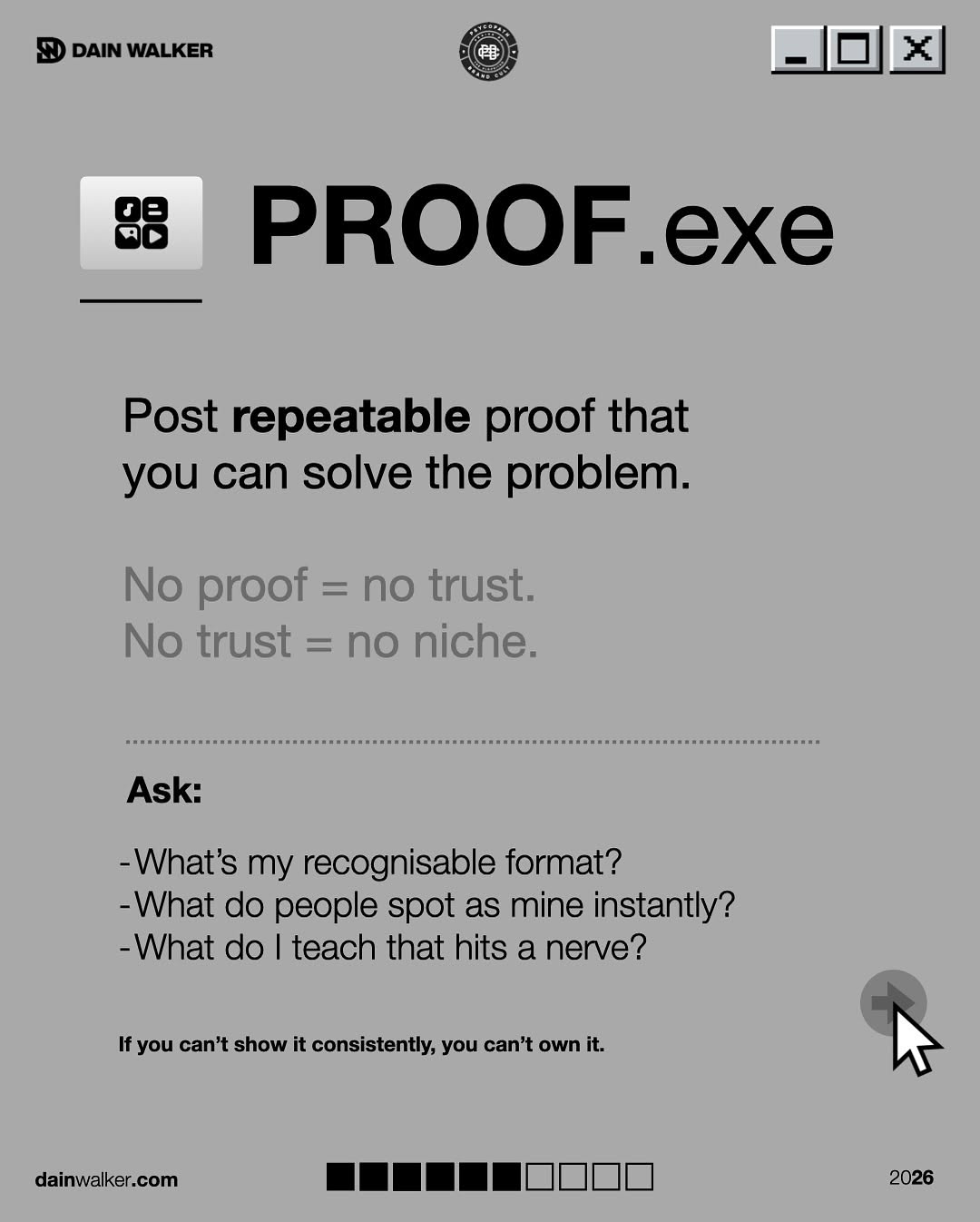 - Design a proof engine: recurring case studies, screenshots, or frameworks you can post weekly.