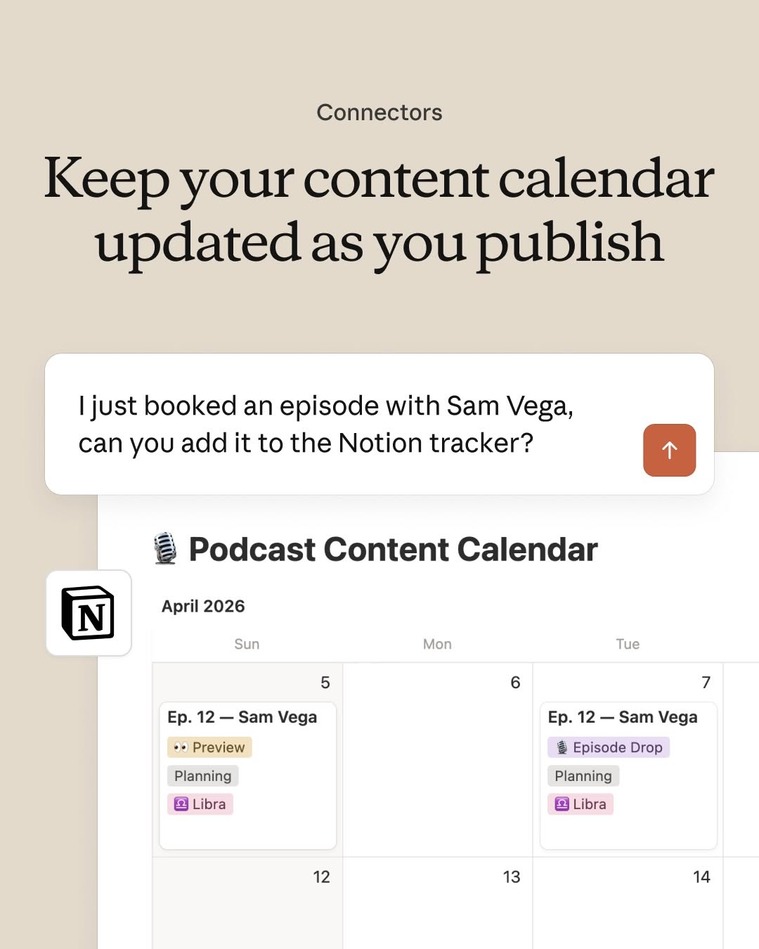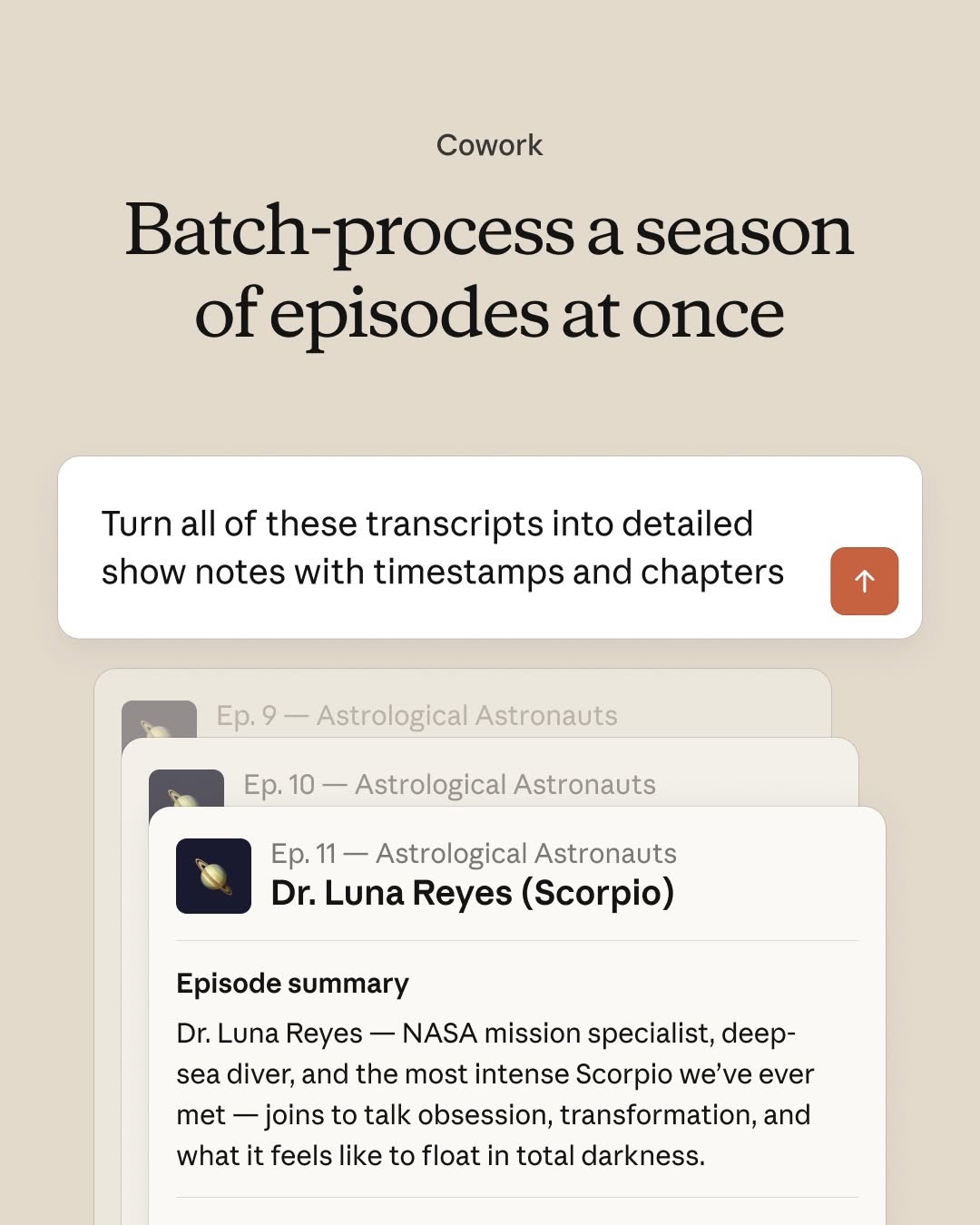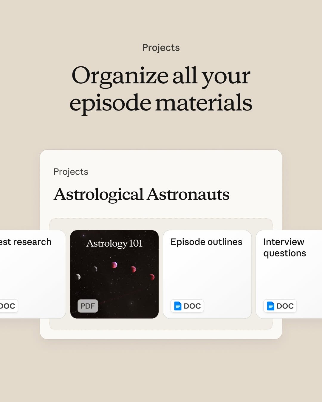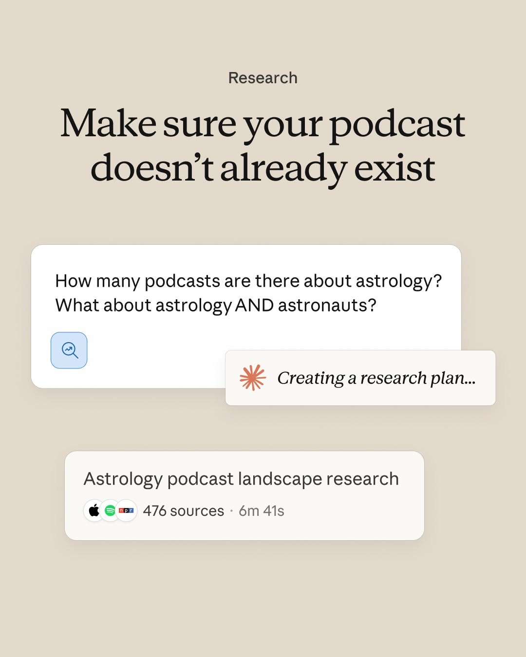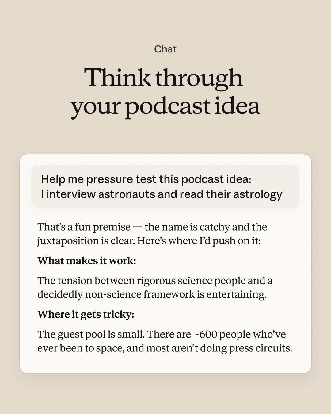 Notice how every image keeps the UI soft, friendly, and low-friction. The copy never says “AI toolset” or “productivity platform” — it shows tiny, believable moments a creator already struggles with: research rabbit holes, messy assets, neglected calendars. By anchoring everything to one oddly specific fake show, “Astrological Astronauts,” Claude feels like a collaborator with taste, not a generic bot. The result: viewers don’t just want the app, they want to open their laptop and finally ship their own weird podcast.