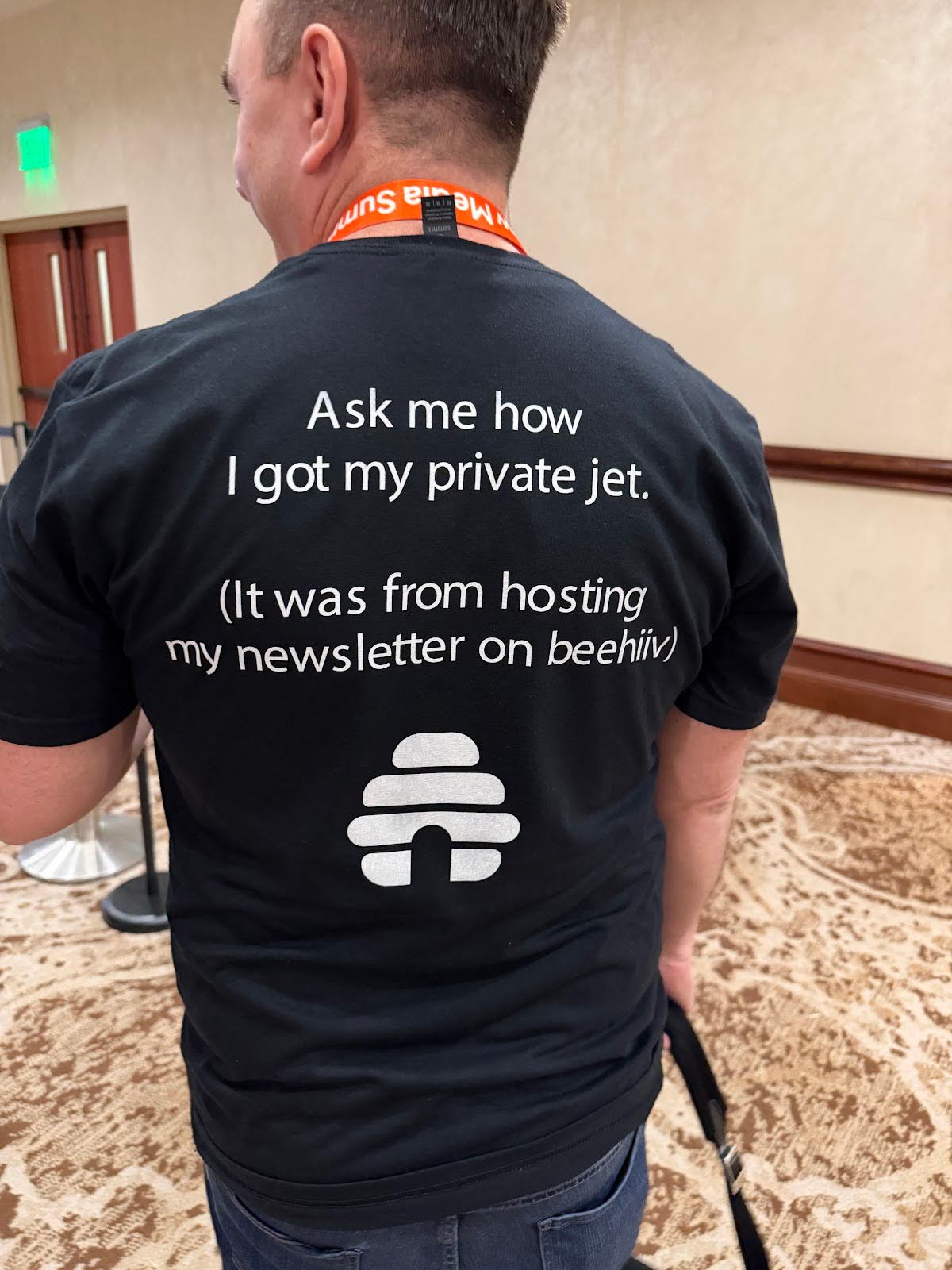 This guy is walking a hotel hallway holding a single dollar bill, yet the back of his shirt casually says: “Ask me how I got my private jet. (It was from hosting my newsletter on beehiiv).” That’s not just flexing, that’s a walking lead magnet.