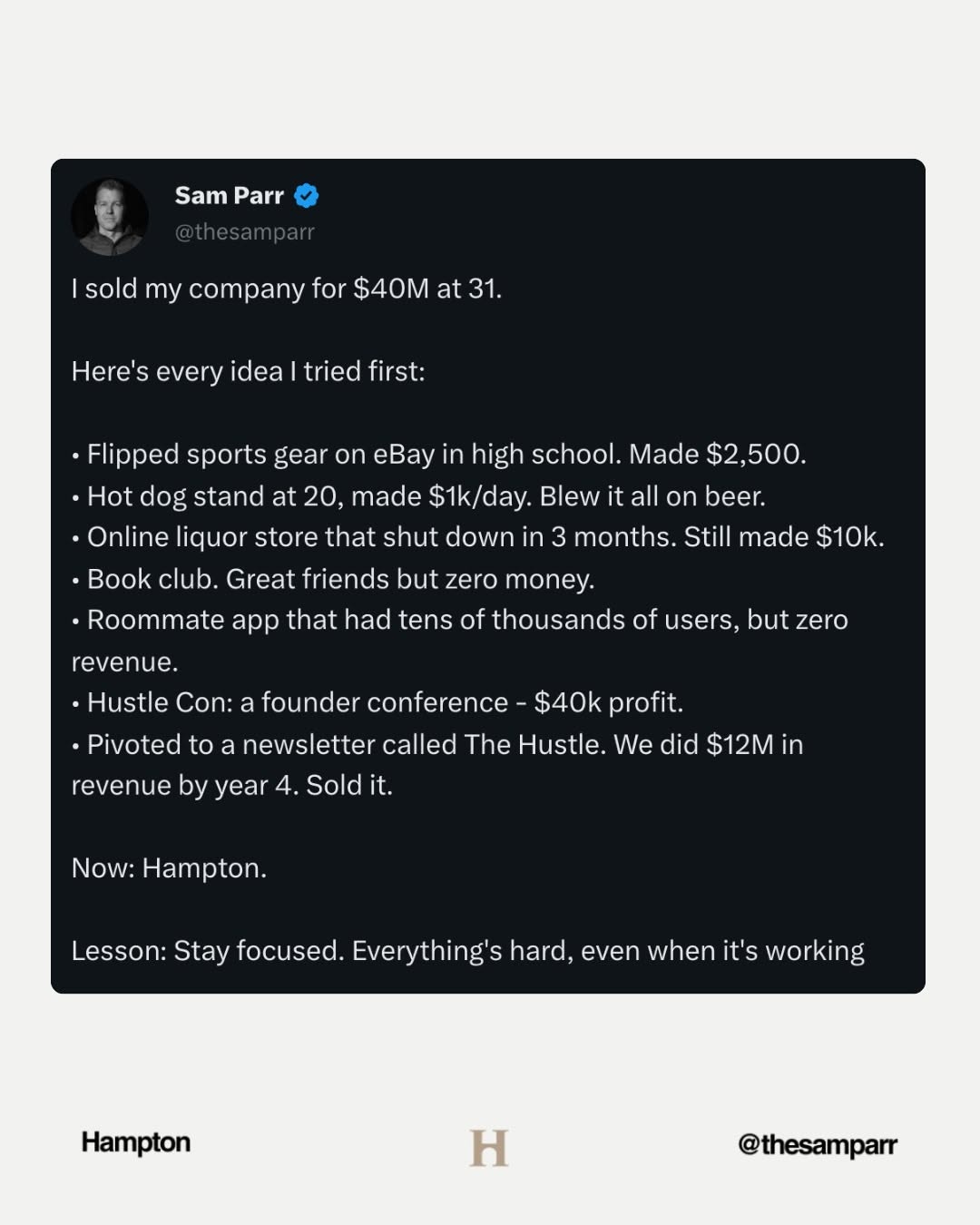 Look at the final slide: a graveyard of fun side hustles, then the decision to double down on one thing that eventually sells for eight figures. That wasn’t a perfect idea; it was a lever choice reinforced by brutal focus. Most of the real work was not sexy—meetings, calls, and consistency over 15 years. If you want similar results, spend less energy optimizing tiny choices and more energy choosing the one thing you’re willing to be bored with for a very long time.