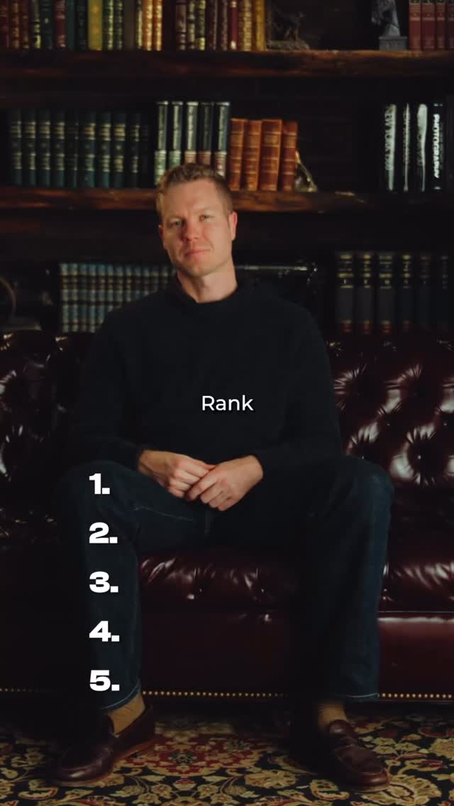 The shot is simple: one person on a leather couch, bookcase behind them, the word “Rank” on their chest, and a vertical list from 1–5 along their leg. It’s not artsy for the sake of it; it’s a mini whiteboard. You’re meant to mentally fill in those five lines with product ideas and force-rank them by “which could I sell this week?” The cozy, serious setting makes it feel like a deliberate exercise, not a random brainstorm.