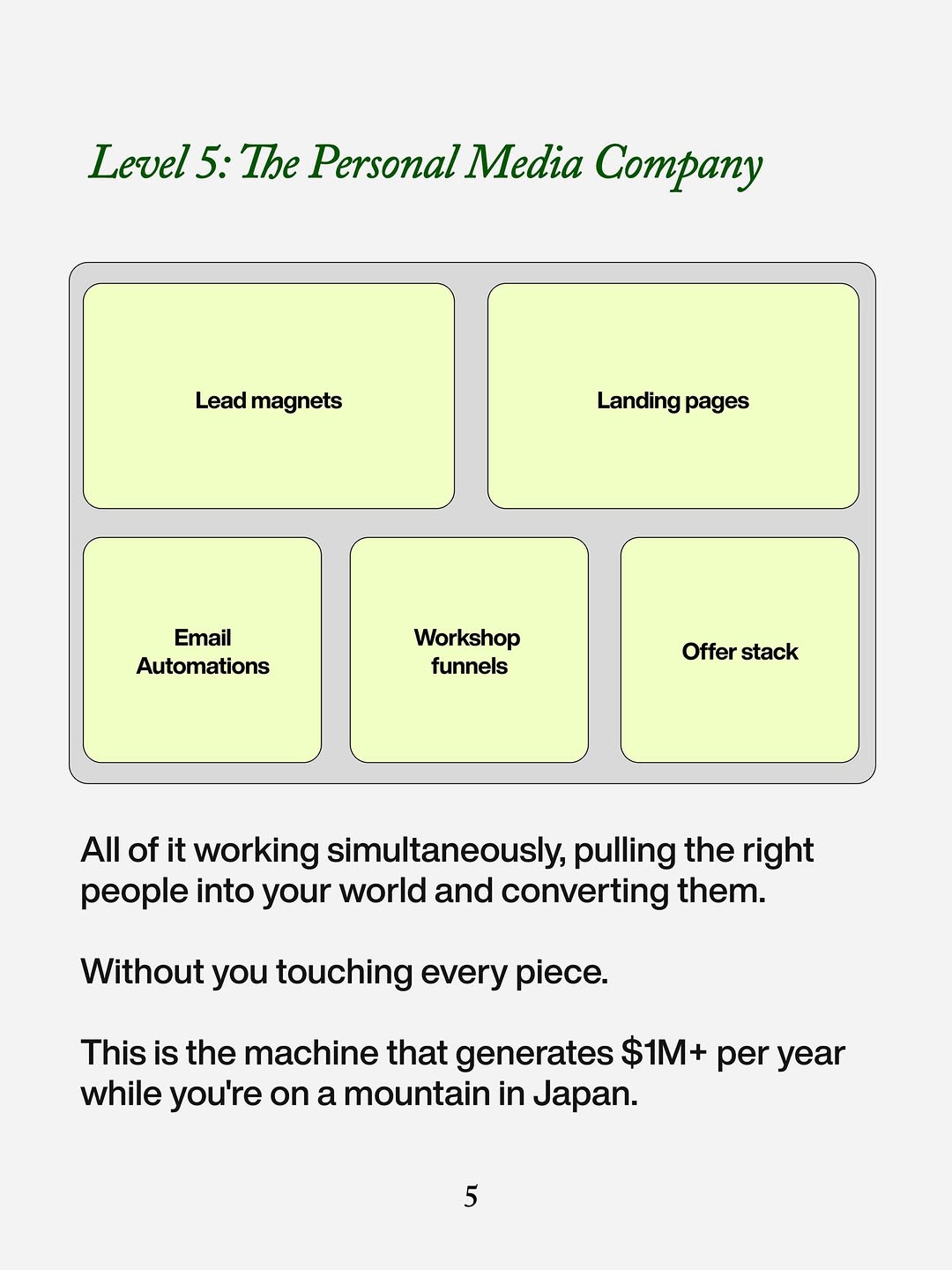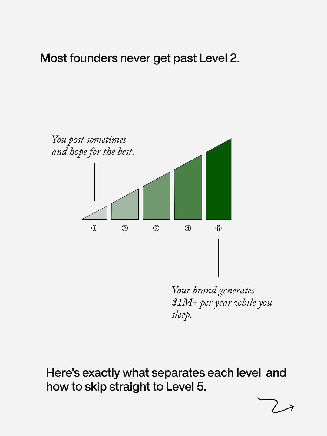 - Starts with a simple bar chart of 5 levels; most founders are circled at Level 1, instantly creating status FOMO.