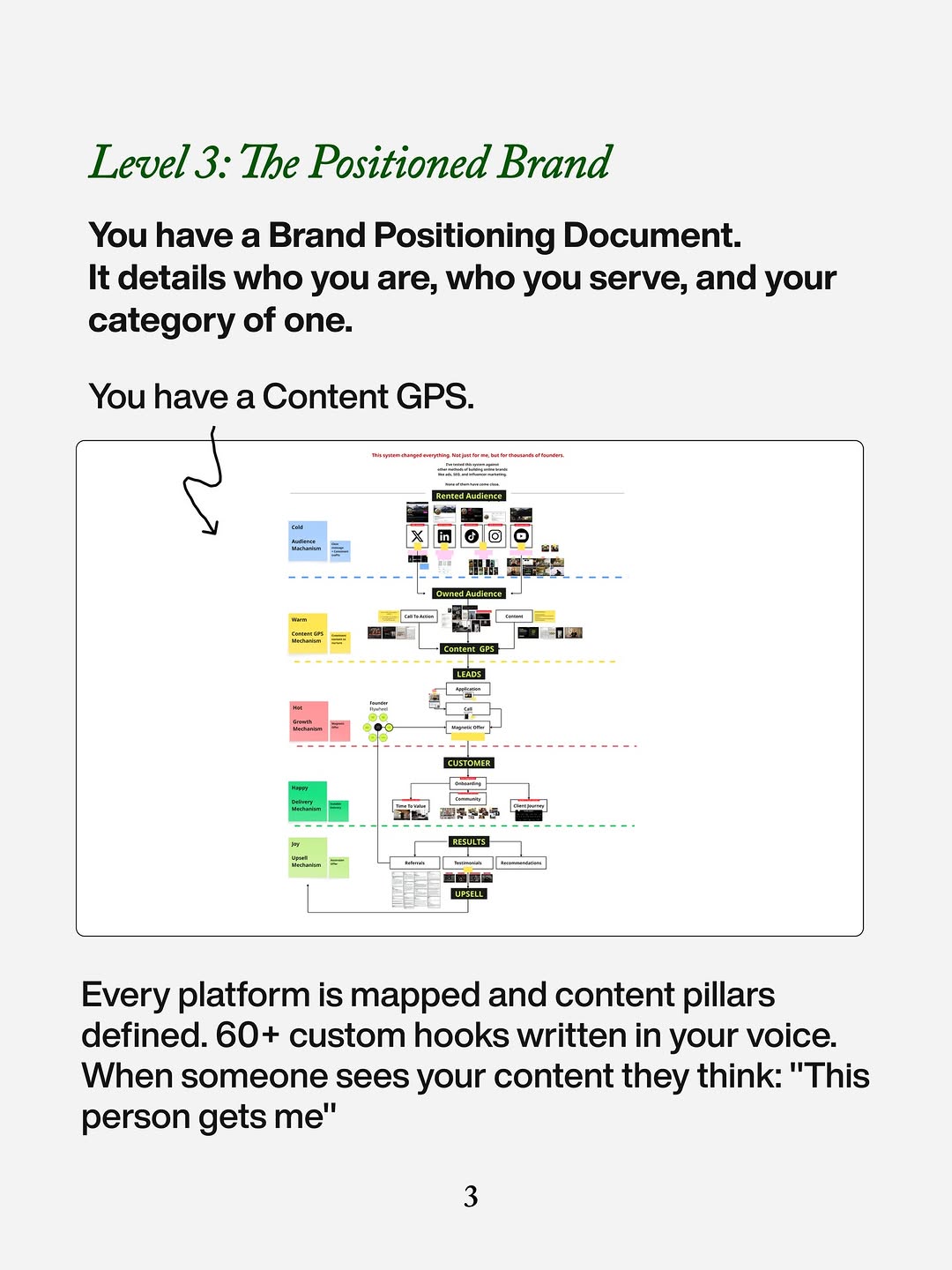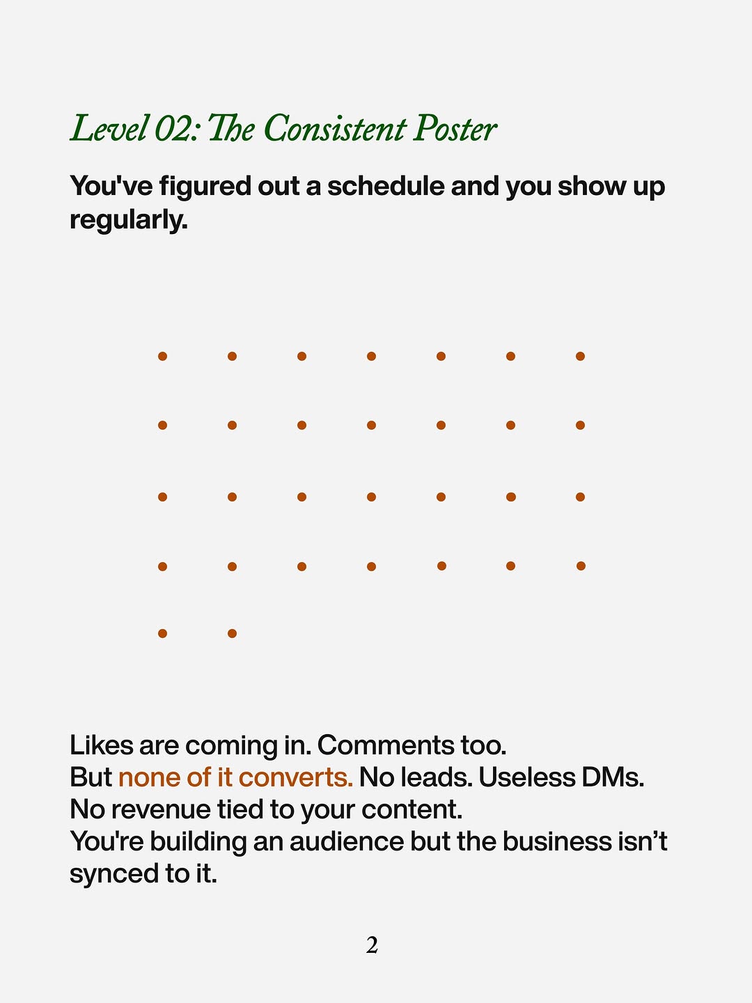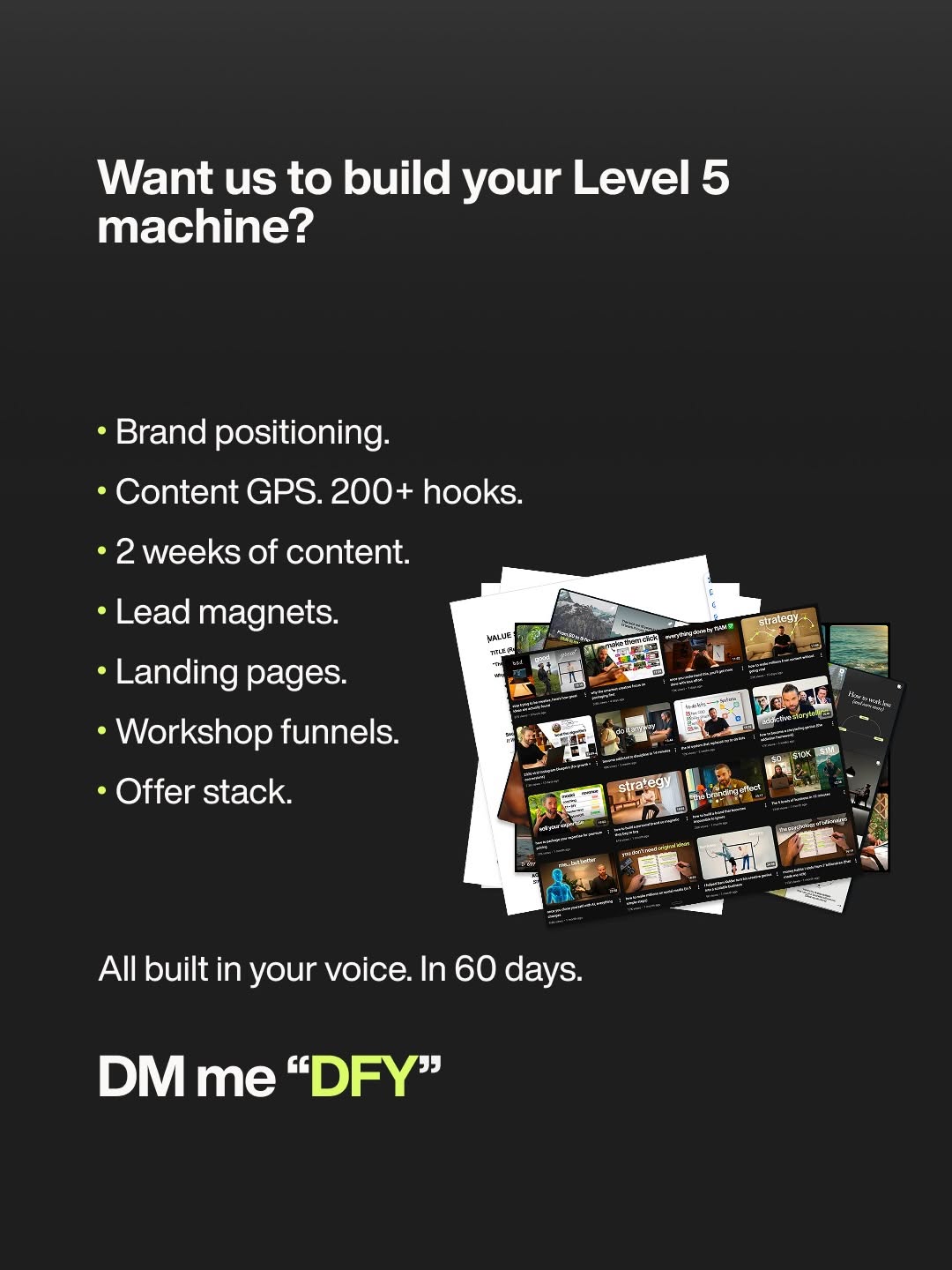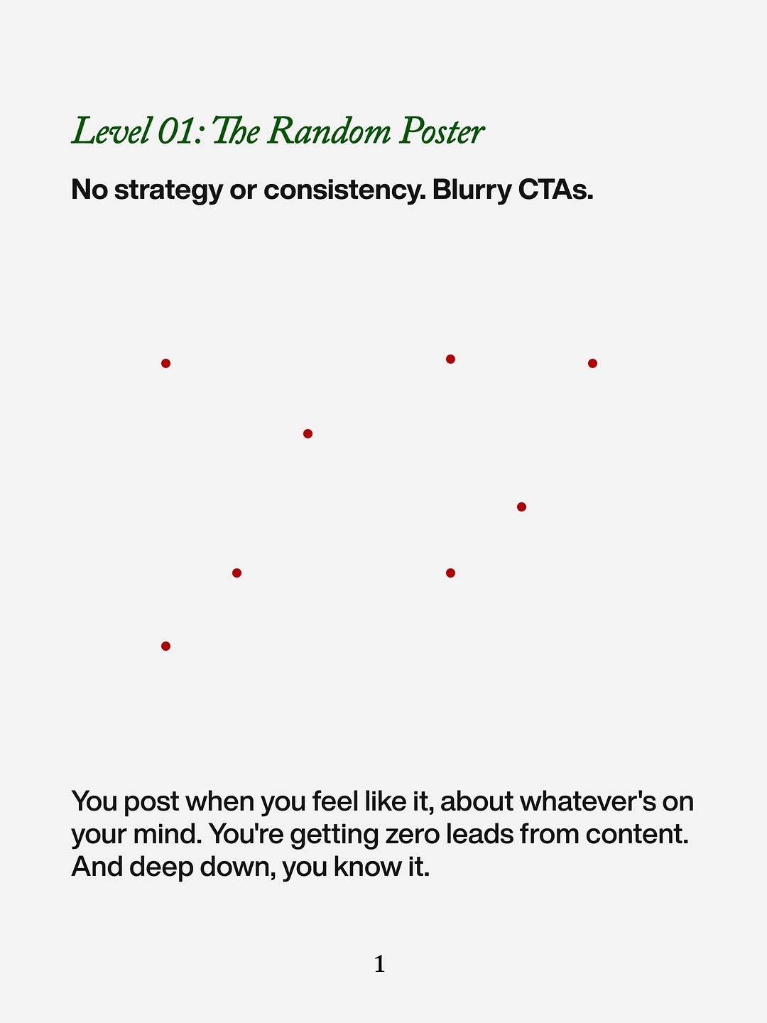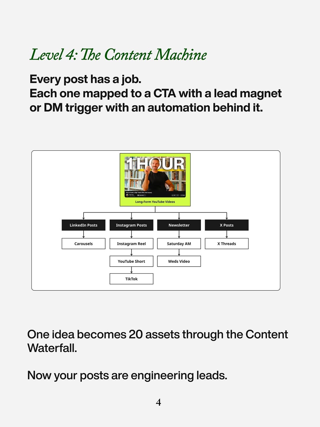 Invent your own 4–6 level ladder from “chaos” to “machine,” then assign each level a clear visual: random dots, neat grid, map, waterfall, dashboard, etc. On each slide, describe the same three things: what the person is doing, what’s broken, and what result they really want. Save the full promise for the last frame: a concrete asset count, a fixed time window, and a low-friction response (DM keyword, reply with a word, click). The structure sells the upgrade before you ever pitch the service.