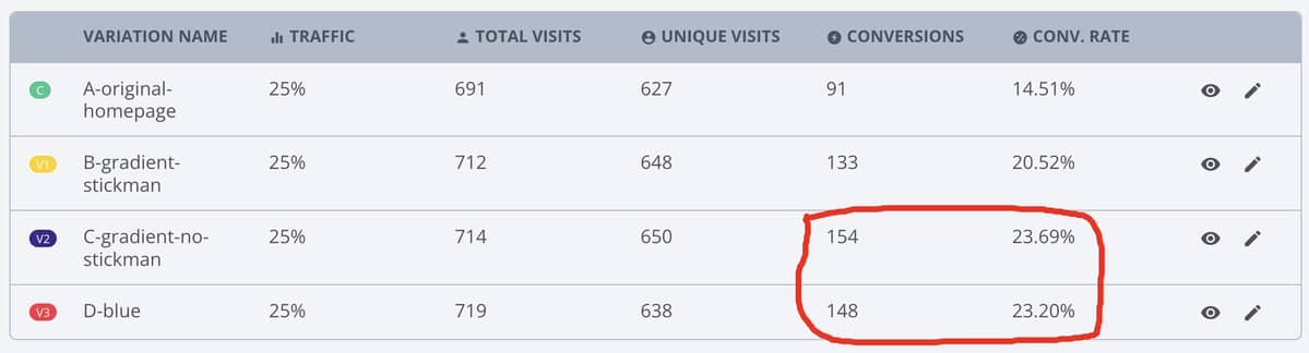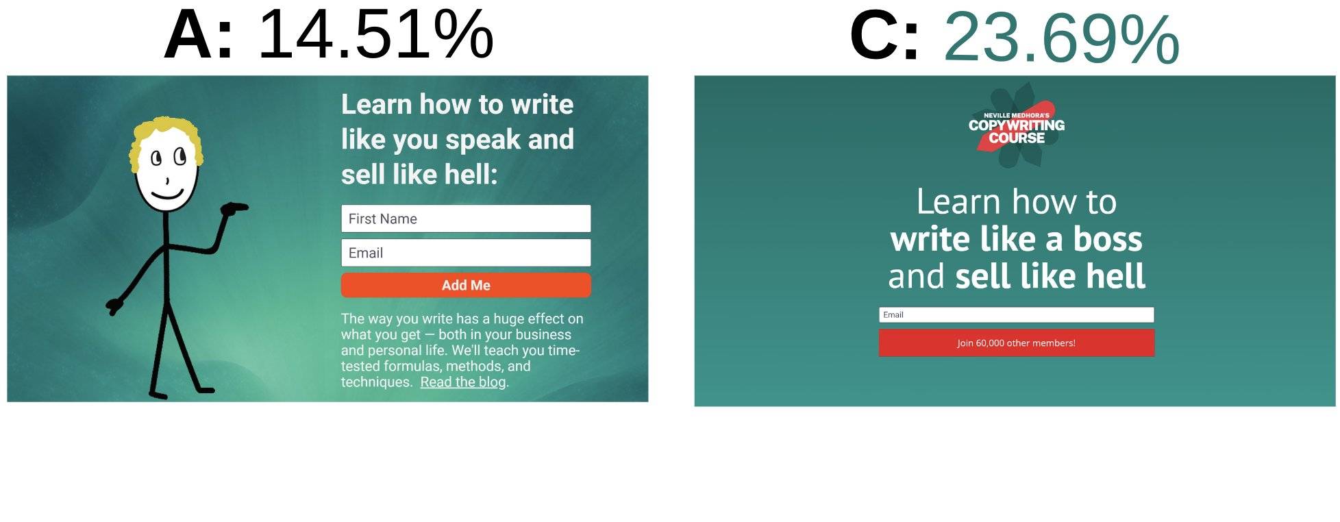 This means if 100 people come to the homepage, instead of 14 of them signing up to my email list, 23 of them signup. A ~60% increase.