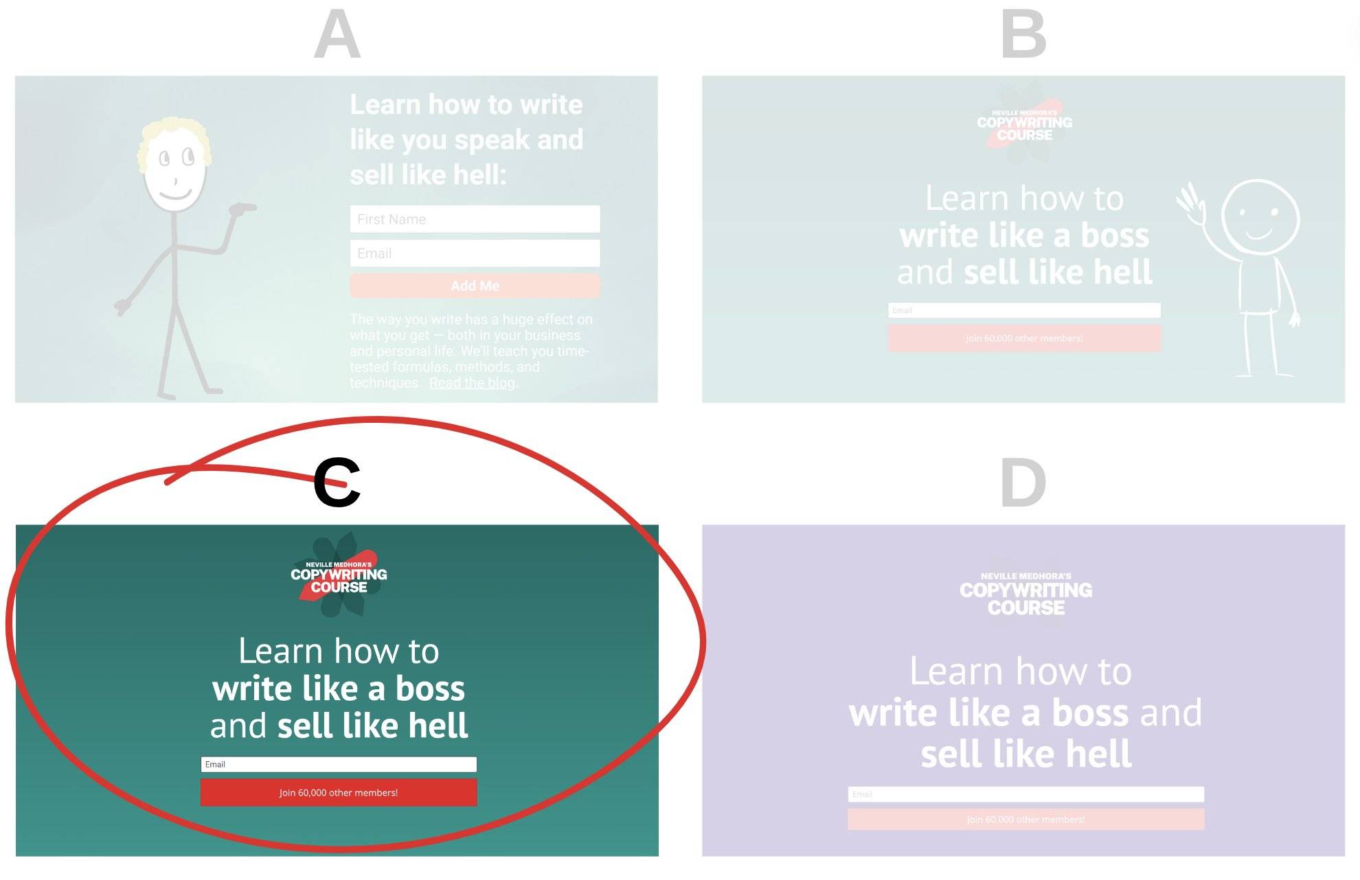Last week I posted this homepage a/b/c/d split test, and asked which you thought would win??
