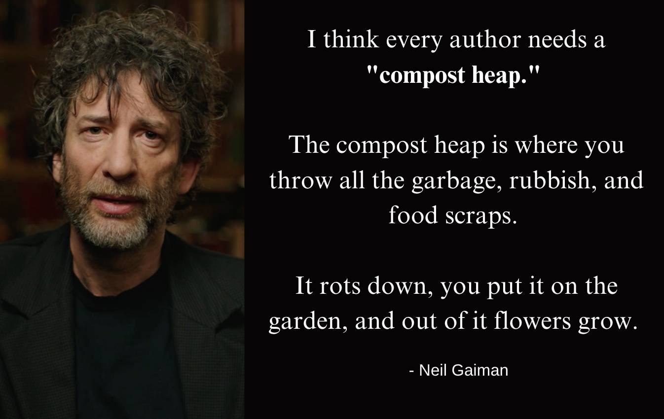 A great quote from Neil Gaiman (writer) about collecting a “compost heap” of ideas and inspirations. I personally call my compost heap a Swipe File and post all my ideas, inspirations, quotes, and swipes on it.
