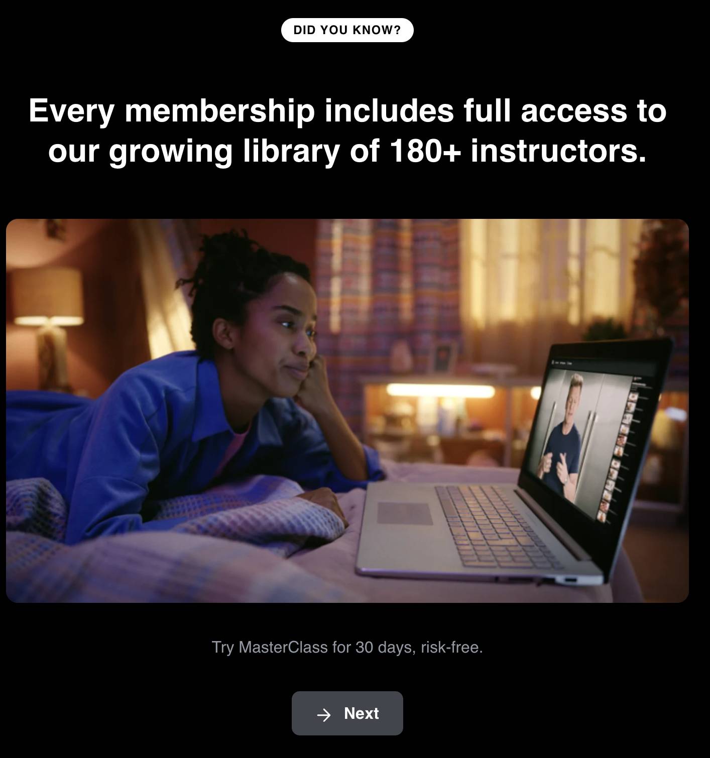 Step 2.) It shows you some key information about MasterClass in the form of slides.