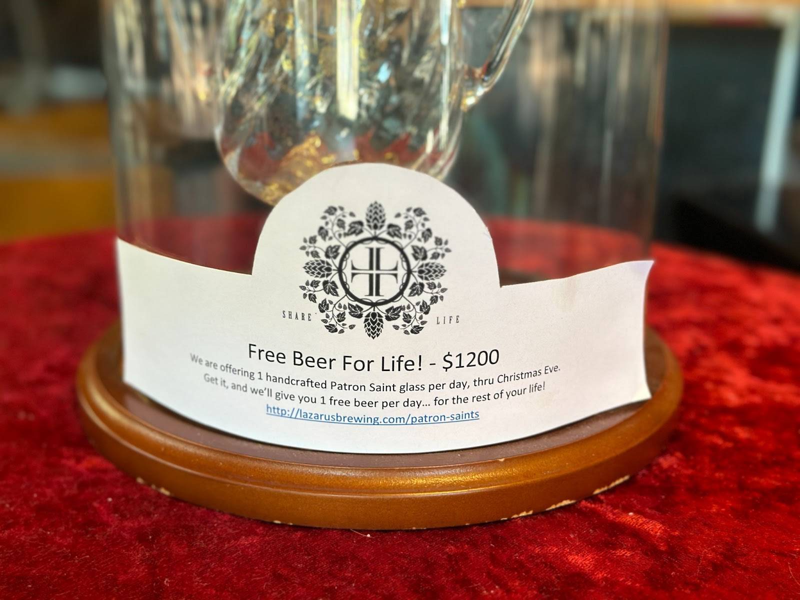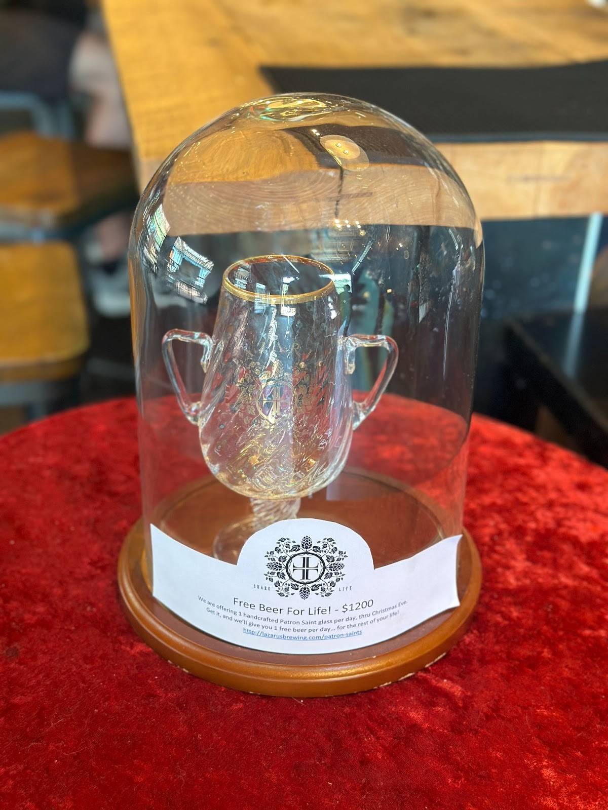 This bar Lazarus Brewing offers a “free beer for life” if you buy this chalice. They initially did it during the pandemic to raise funds for the bar, and it worked so well they continued it!