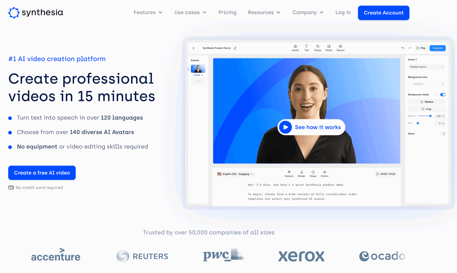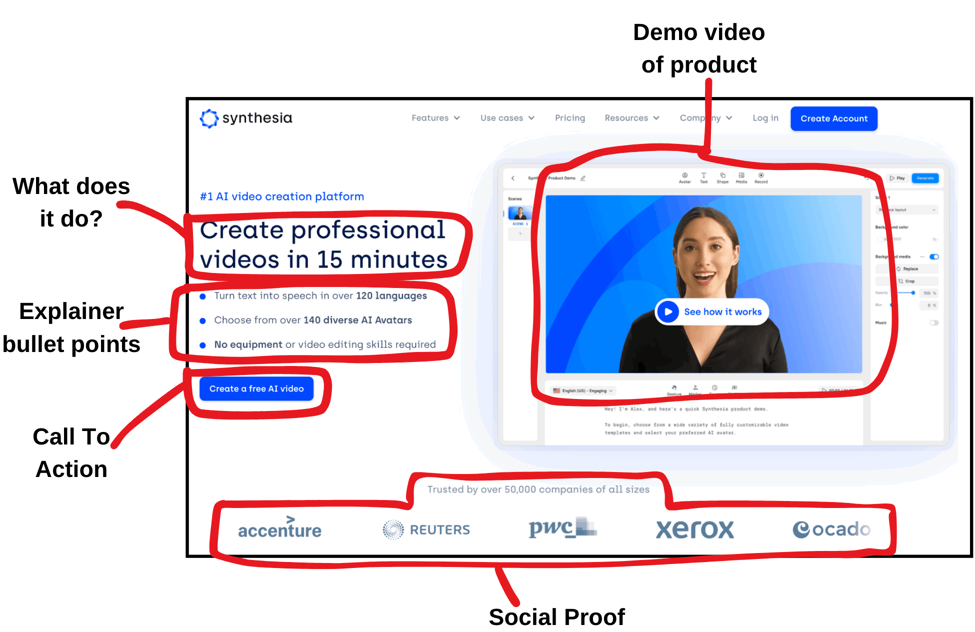 This is a great home page from software company Synthesia. It has an easy headline, 3 key features and benefits, and an explainer video which demo’s the product.