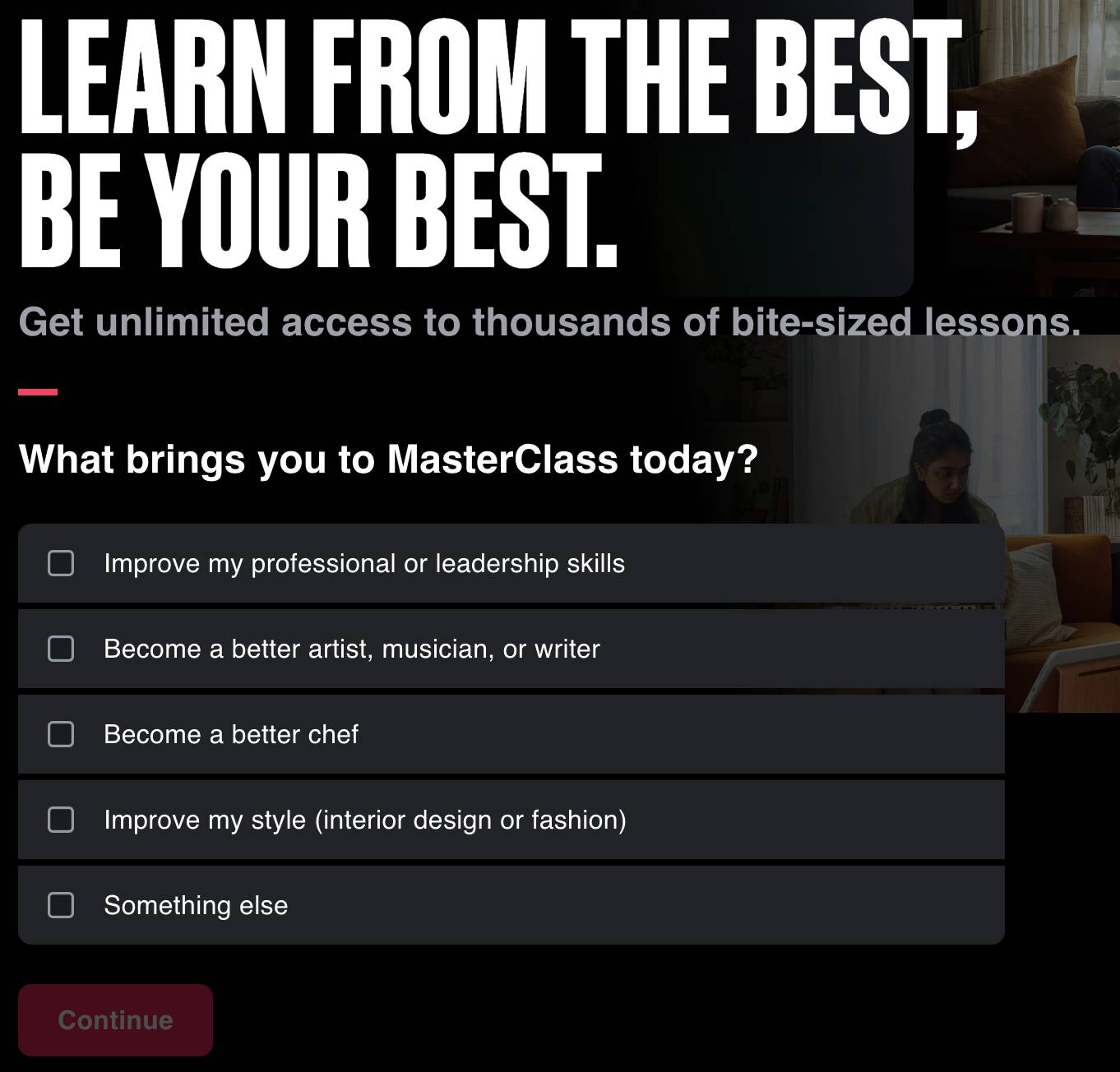 MasterClass has a super interesting sales sequence on their homepage which gets you to purchase in 6 steps.