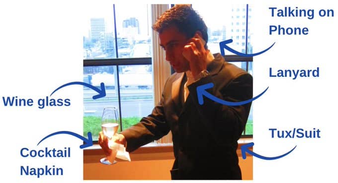 So I'd fill the wine glass, wrap the cocktail napkin around the stem, wear a lanyard under tux (hopefully sort of matching what they give at the event), then walk into the party while on the phone.