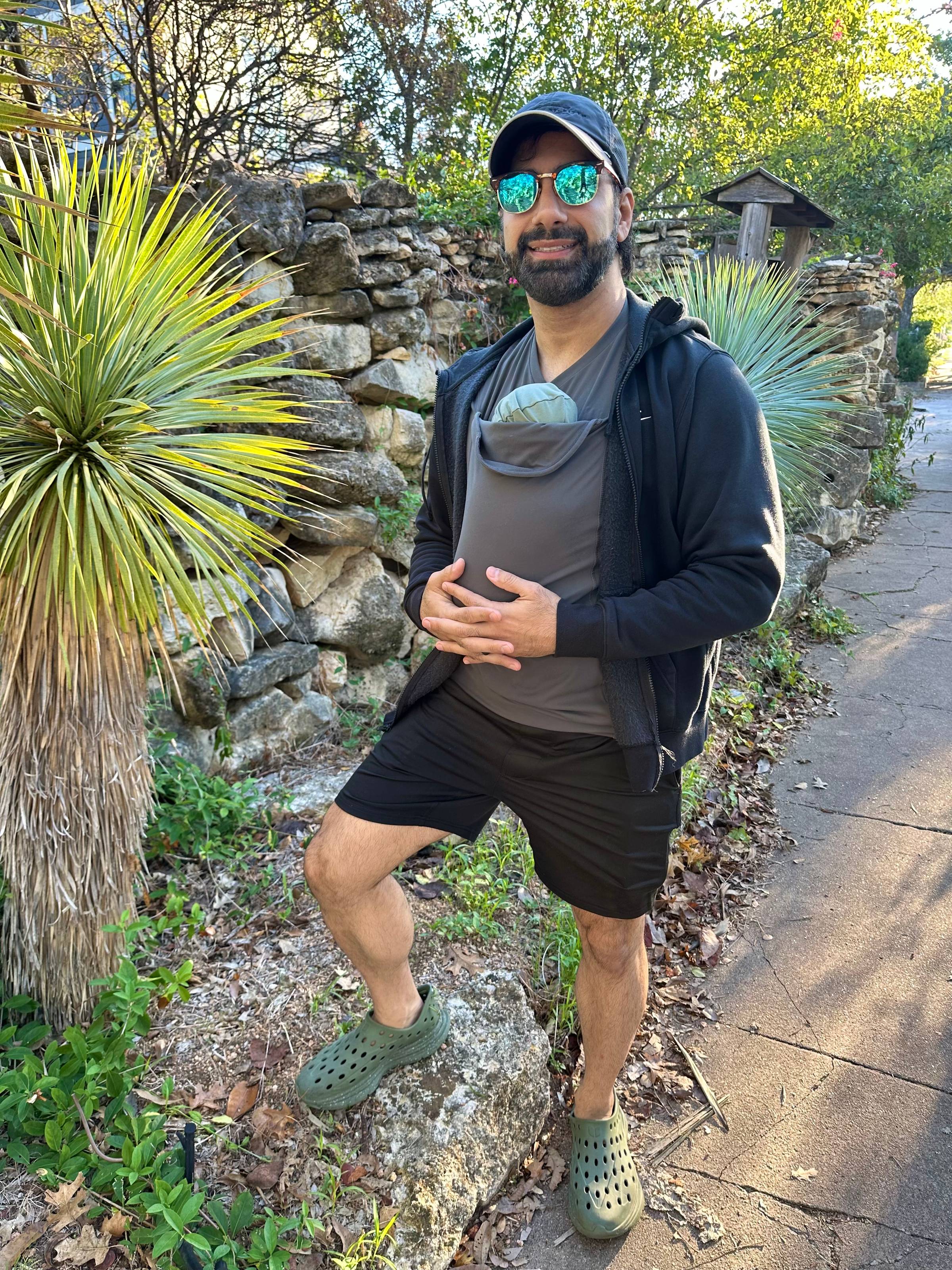 Taking him for walks in my kangaroo shirt:
