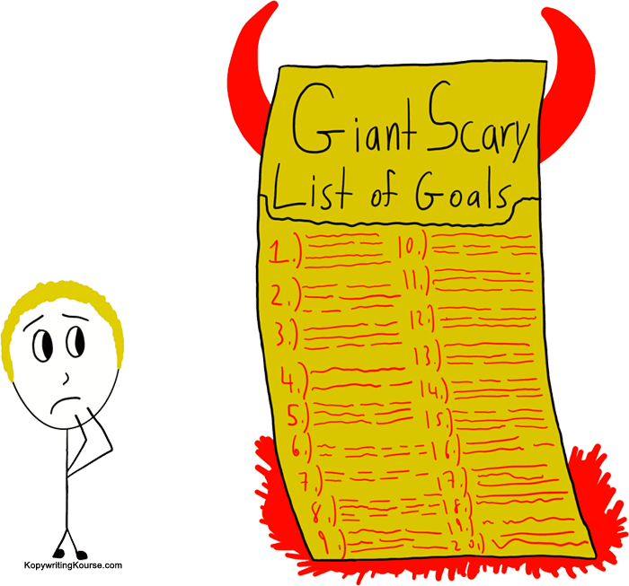 A GIANT list of goals can backfire. Try to keep them short, easy, and small: