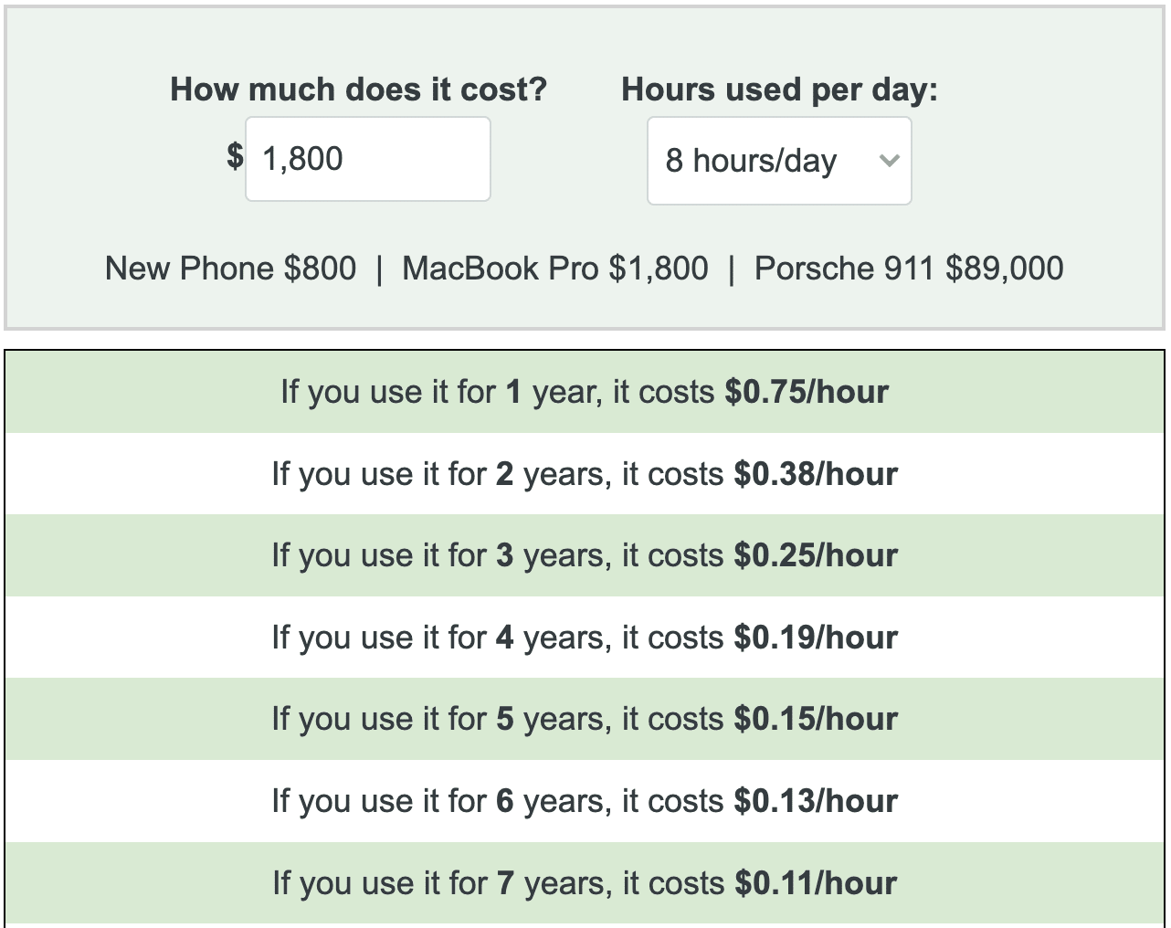 This reminds me of a Cost Analysis Calculator I made that tells you if it's worth it to buy a product based on it's price and how many hours a day you use it: