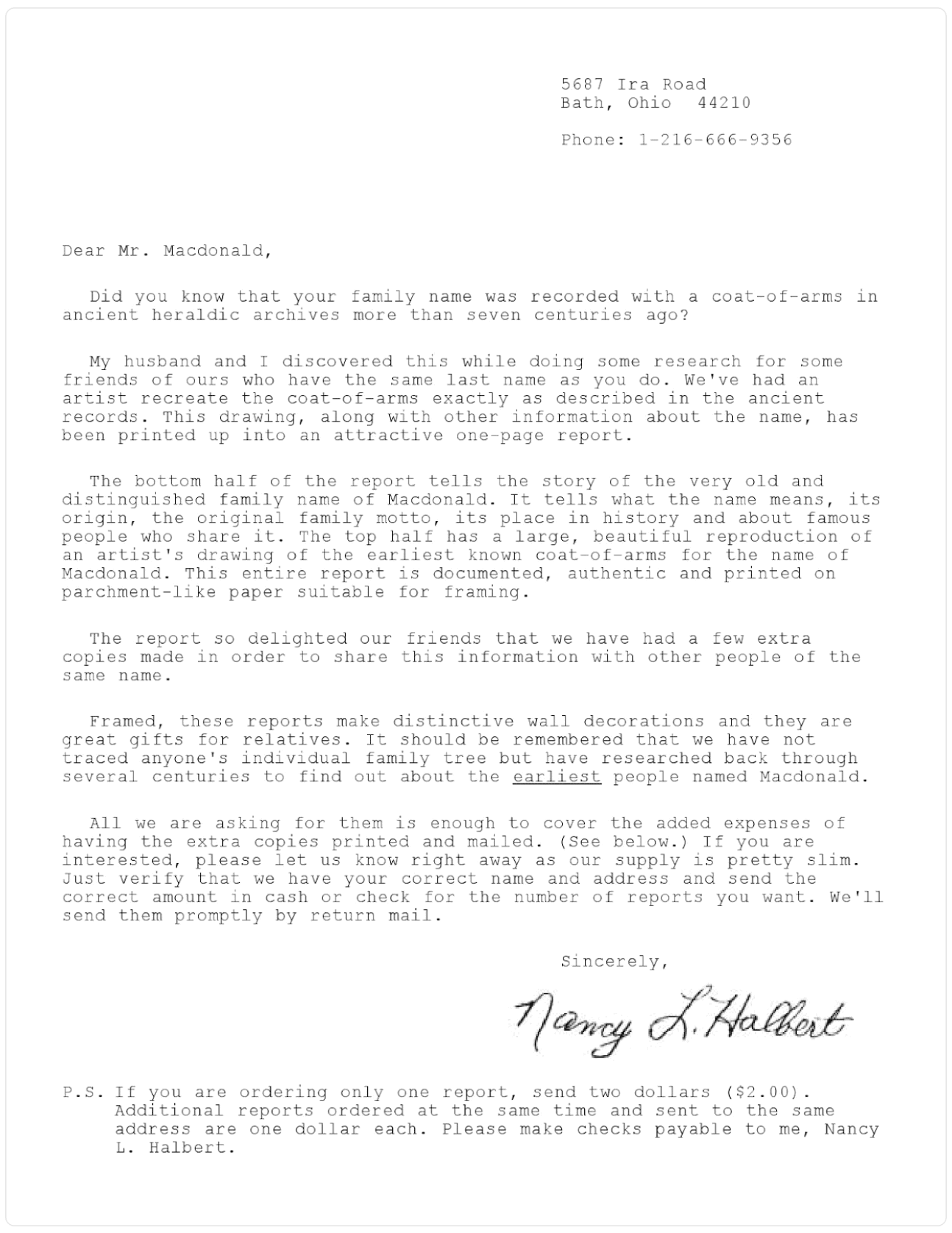 This one was sent to every person with the “Macdonald” last name across the United States.