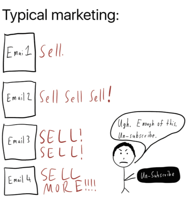 The reason is that "typical marketing" is just people trying to constantly sell a product, and then people get tired of your emails....like this: