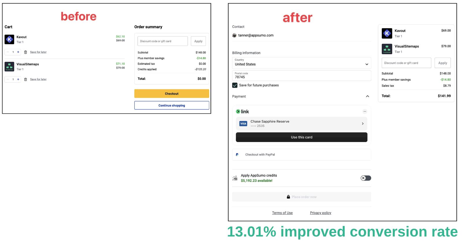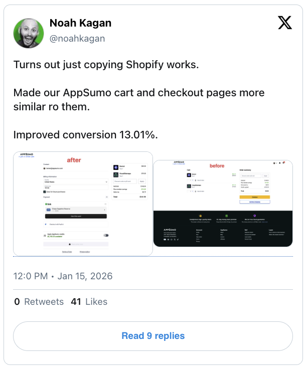 Noah Kagan simply copied a Shopify checkout page very closely, and AppSumo instantly saw a 13.01% conversion bump!!