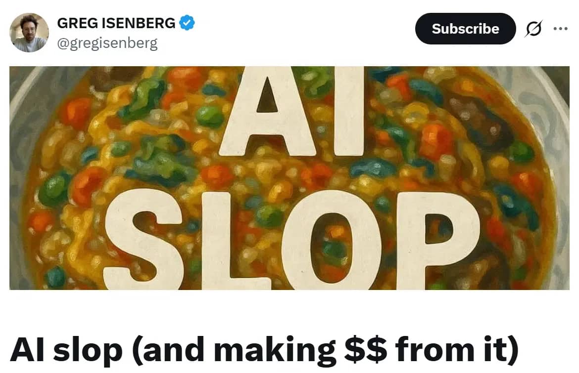 This was an interesting (and kind of long read) by Greg Isenberg about "AI slop" - the flood of generic, AI-generated content saturating the internet.