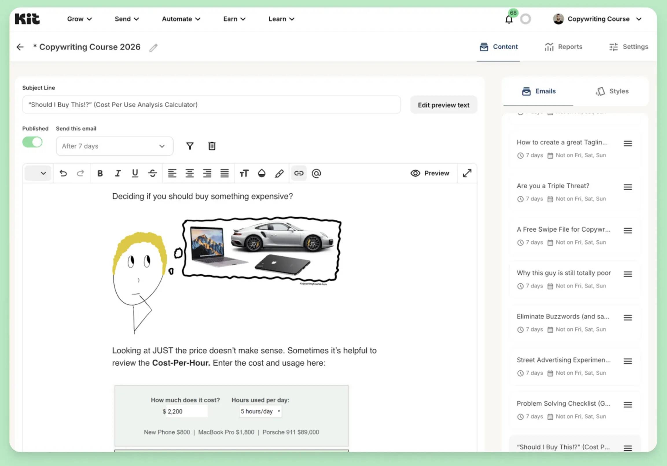 For example if I get hit by the proverbial bus today, for MONTHS my new subscribers would still get great emails thanks to automated sequences: