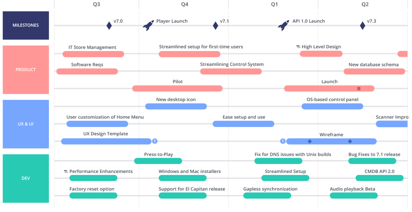 Especially if you have a product which is a subscription a calendar can be very useful, like this launch roadmap that covers 4 quarters: