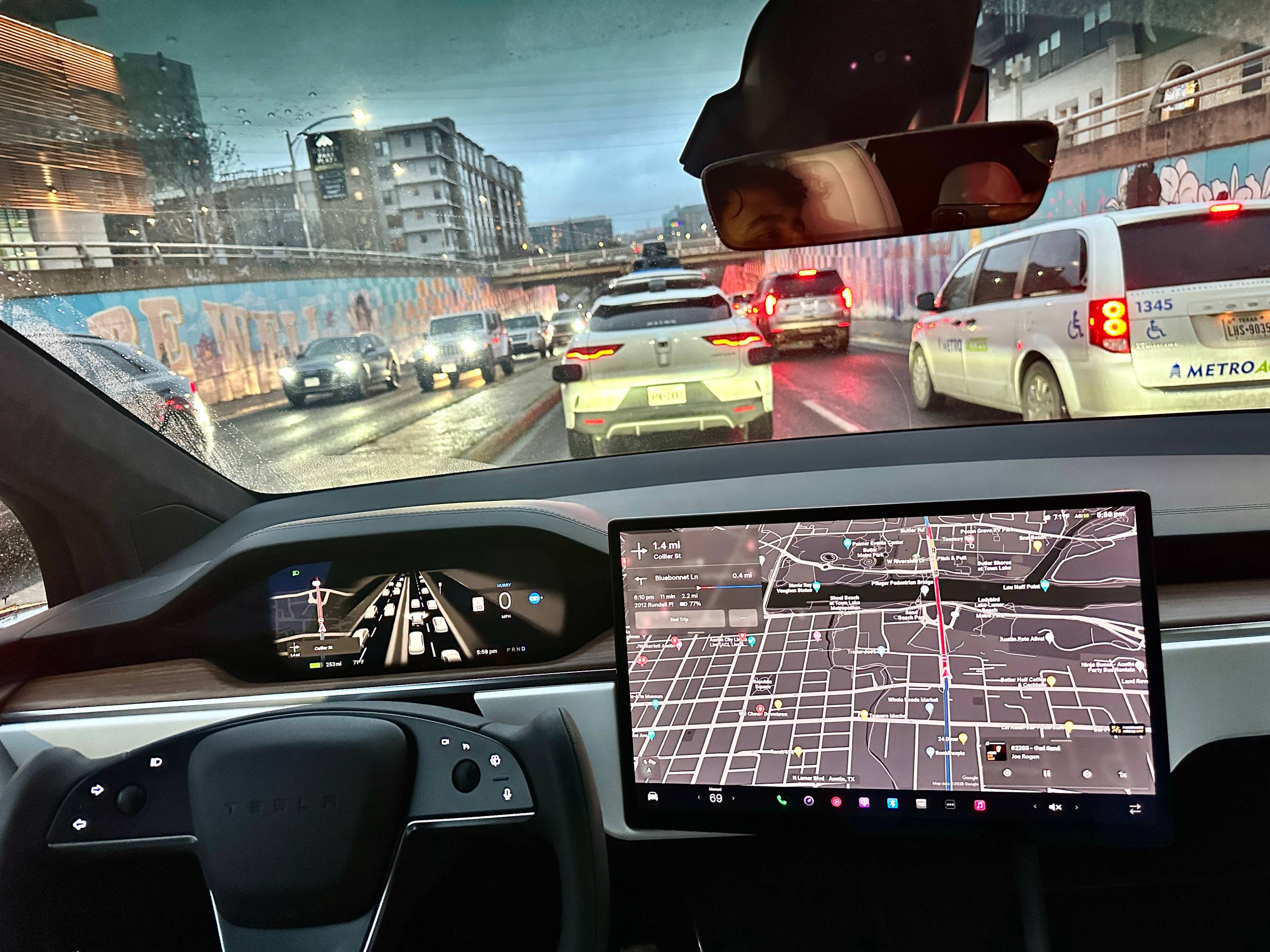 This is me sitting in heavy/rainy traffic with my full self driving turned on, and the car completely driving for me the entire trip: