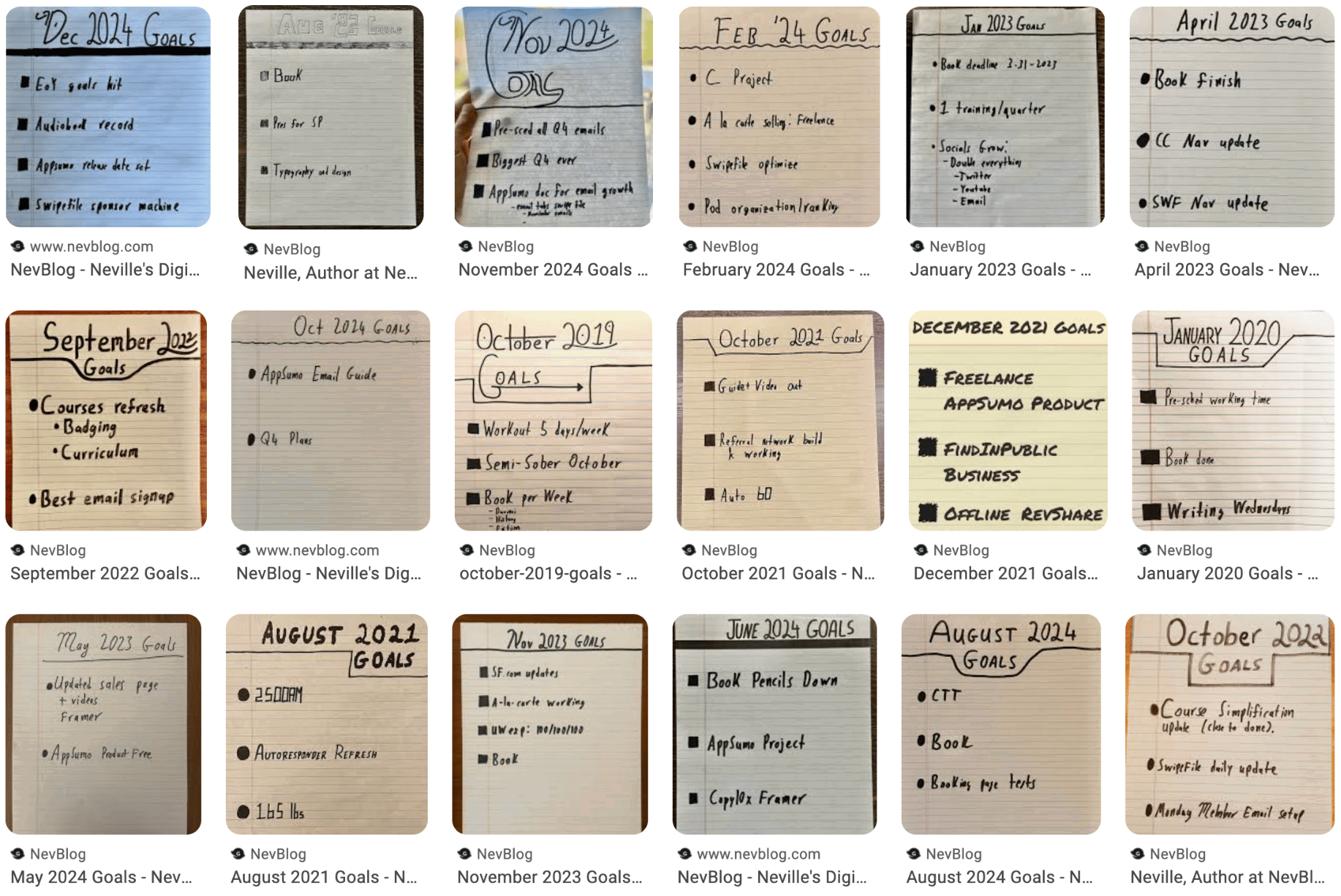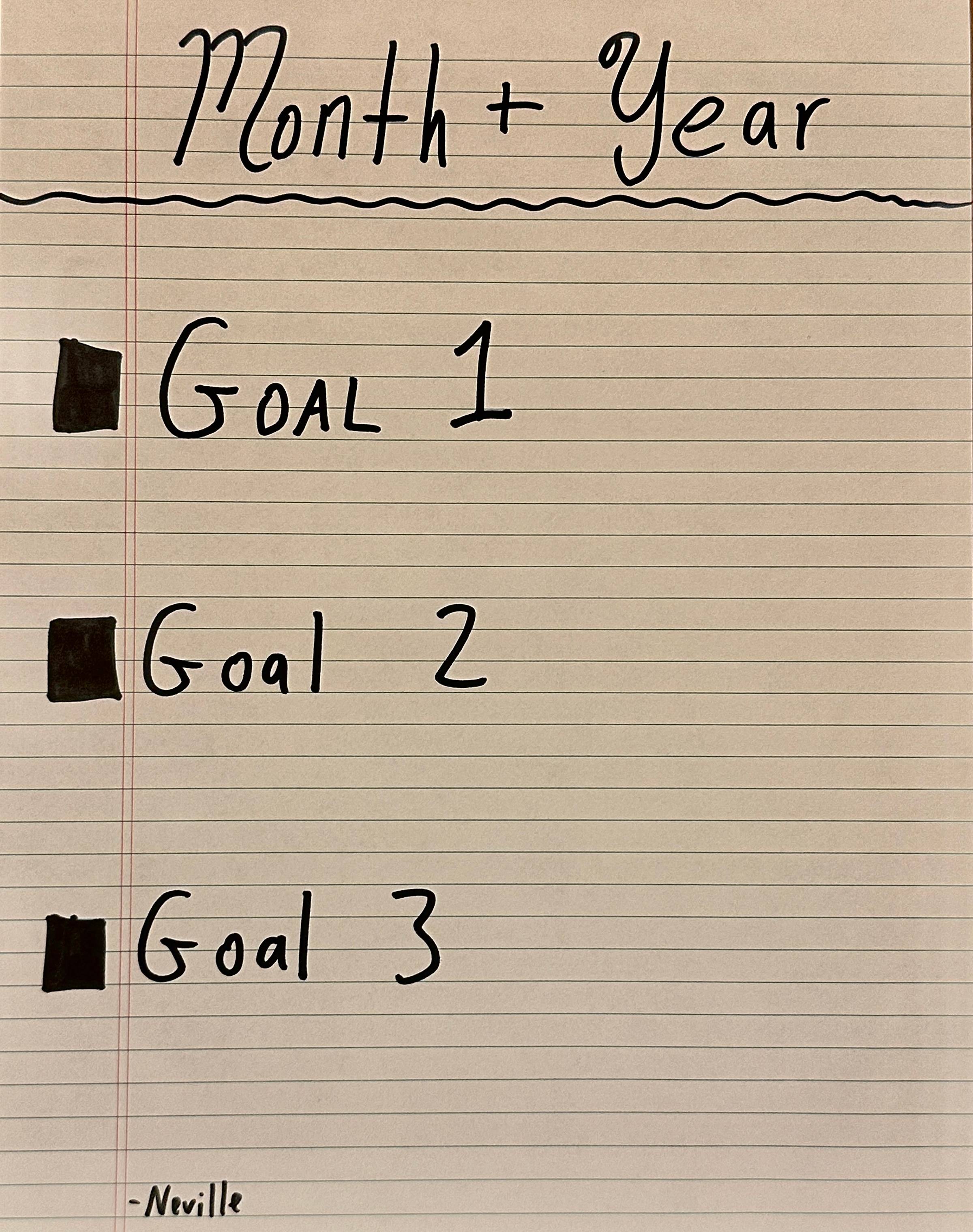It's not the most mind-blowing formula or anything, just list out the month, write a MAXIMUM of 3 goals, and stick it up on the wall somewhere: