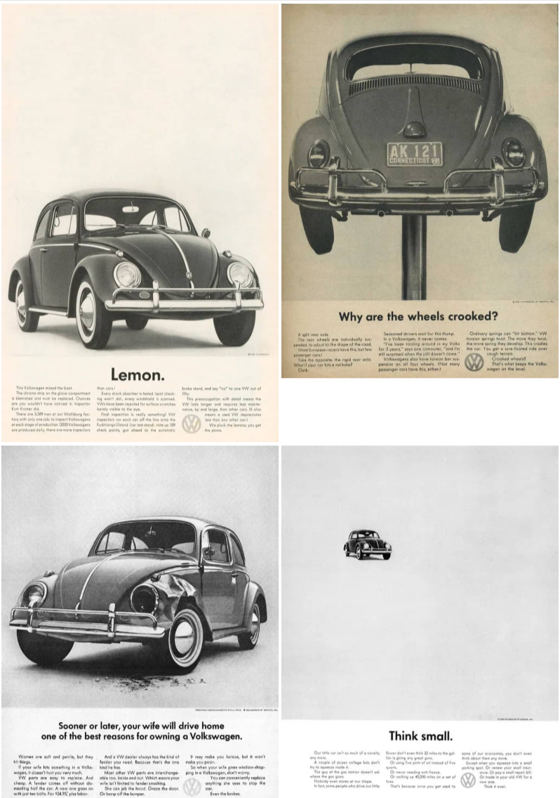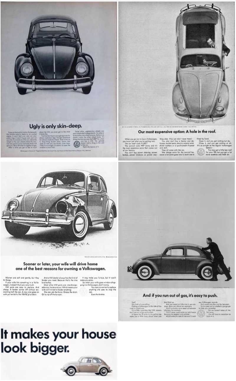 Every single ad had a catching visual (bc the VW Bug was just such a unique looking car), and they all kind of poked fun of the flaws/drawbacks of the car too which was smart.