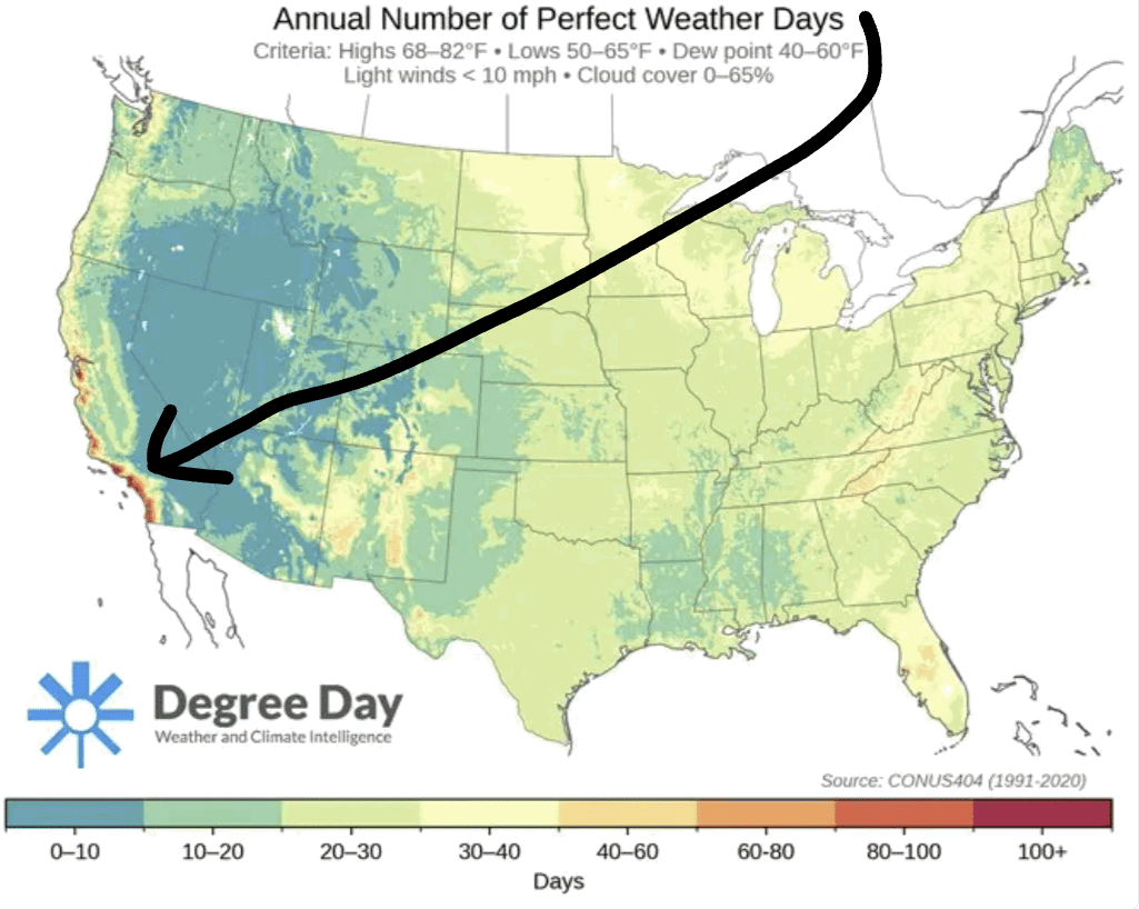 As someone who would go to SanFrancisco as often as possible during the Texas summers, I can confirm California by far has the best year-round weather in the United States: