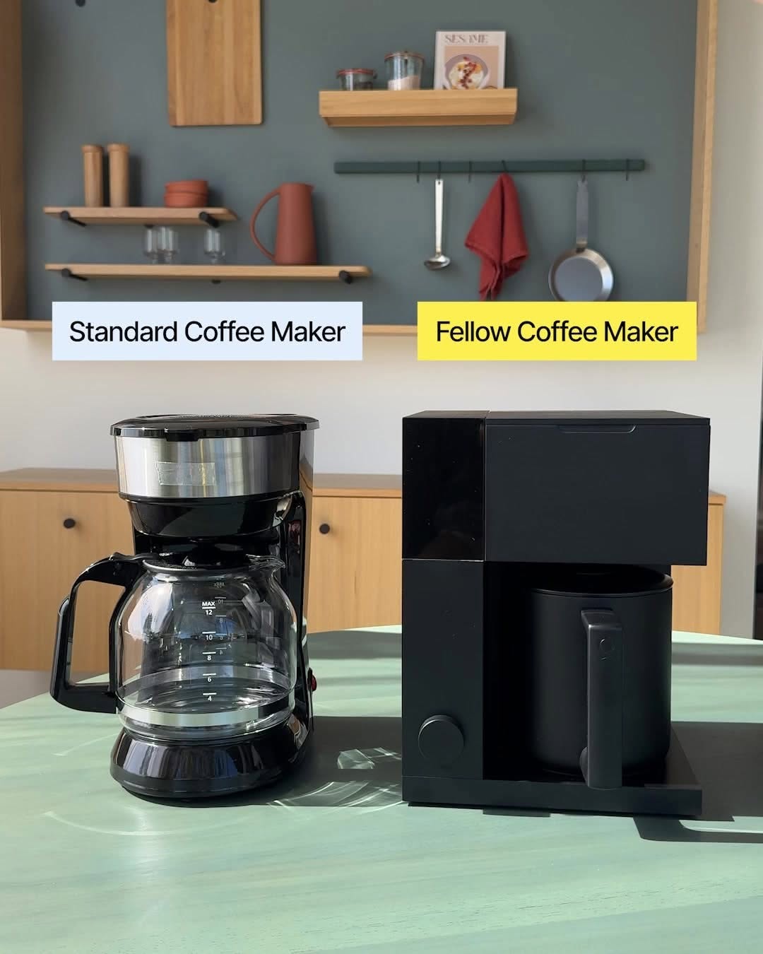Fellow Products stages the “Standard Coffee Maker” beside its sleek machine to make burnt pots feel like a downgrade before you even press play.