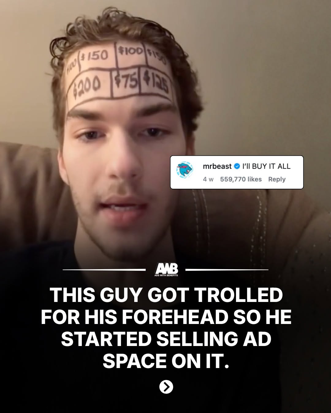 adswithbenefits Will Baron got roasted online for having a big forehead. He responded by drawing ad slots on it with...