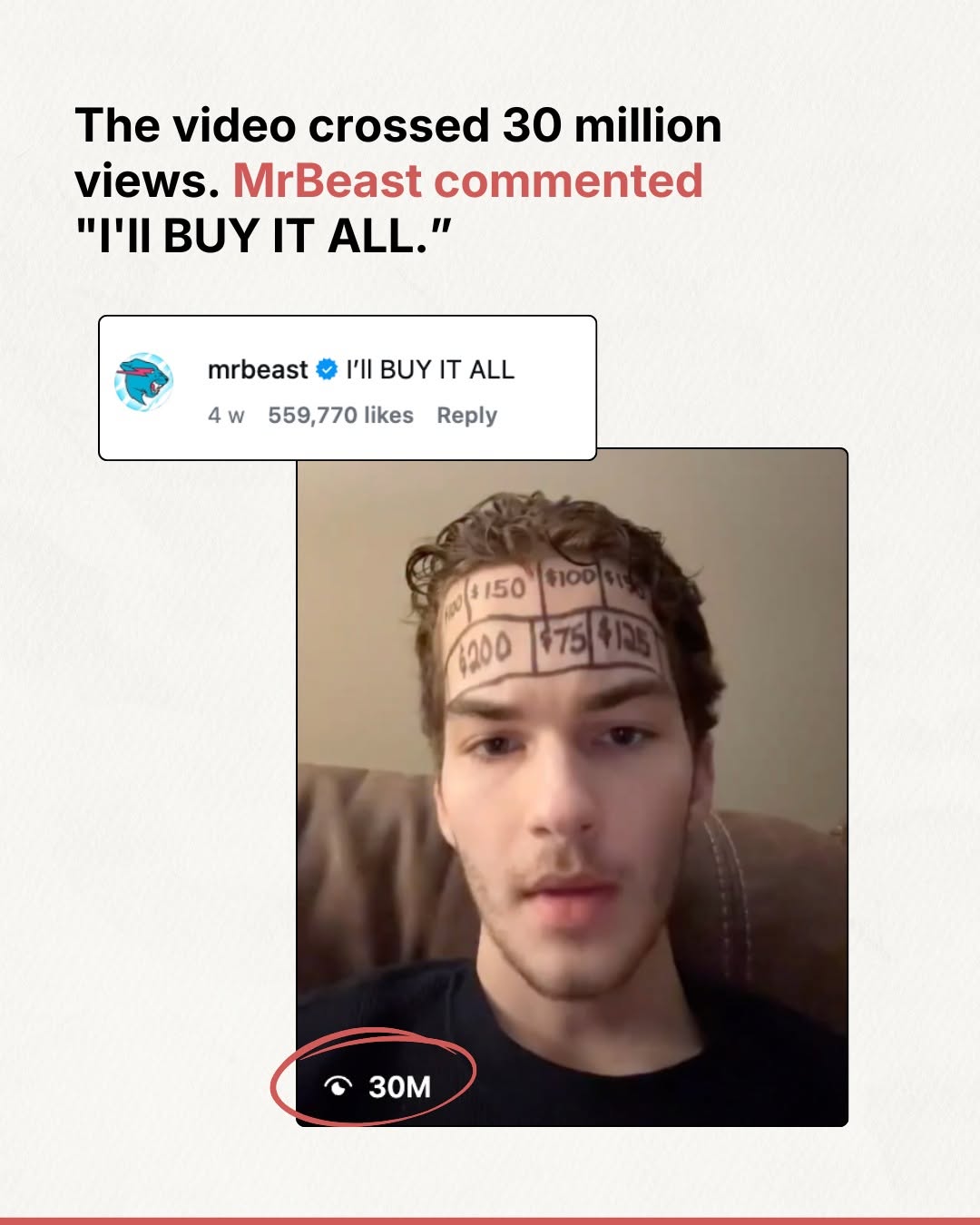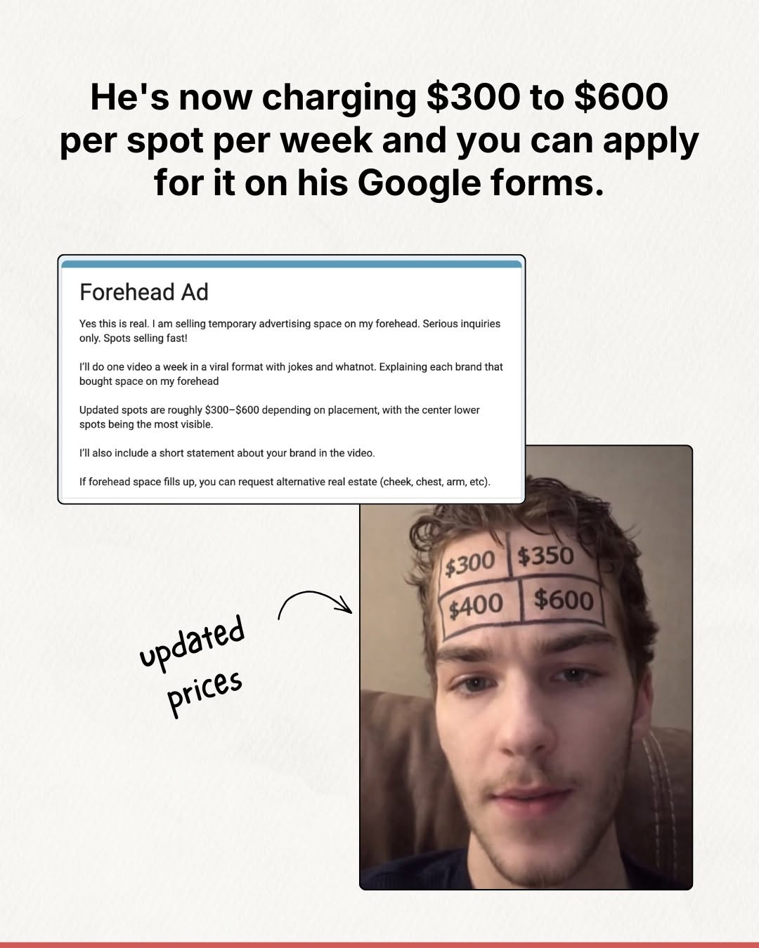 Most people get roasted online and just cry in the comments. Willfred got roasted for his “big” forehead and literally turned it into a billboard. The photos show his face covered in Sharpie price tags, brands lining up in the comments, and a Google Form turning trolling into a media kit. That’s not a meme, that’s a monetization strategy.